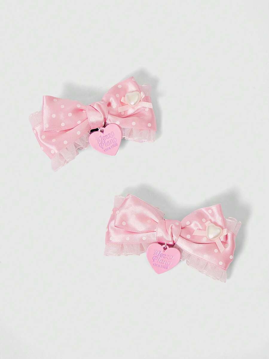 Kawaii زوج من مشابك الشعر الوردية المطبوعة بالقلوب والنقاط والأقواس الدانتيل، إكسسوارات شعر بأسلوب كاواييي وأنيق مناسبة للاستخدام اليومي والمدرسة والمواعيد والتسوق