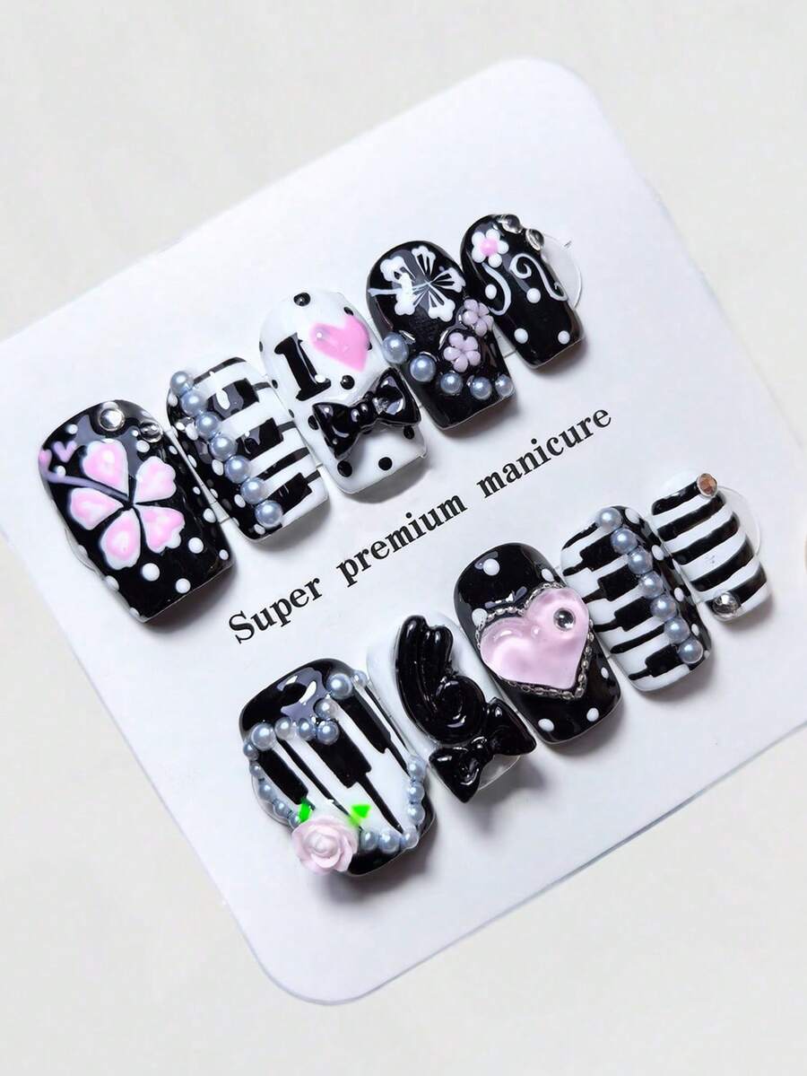 10 قطعة من الأظافر الصناعية بطراز Y2K باللونين الأسود والأبيض مع رسومات يدوية لأزهار الكرز، ألماس راين عالي الجودة بطراز رجعي، قابلة لإعادة الاستخدام في جميع المواسم، مناسبة للاستخدام اليومي والمناسبات والحفلات