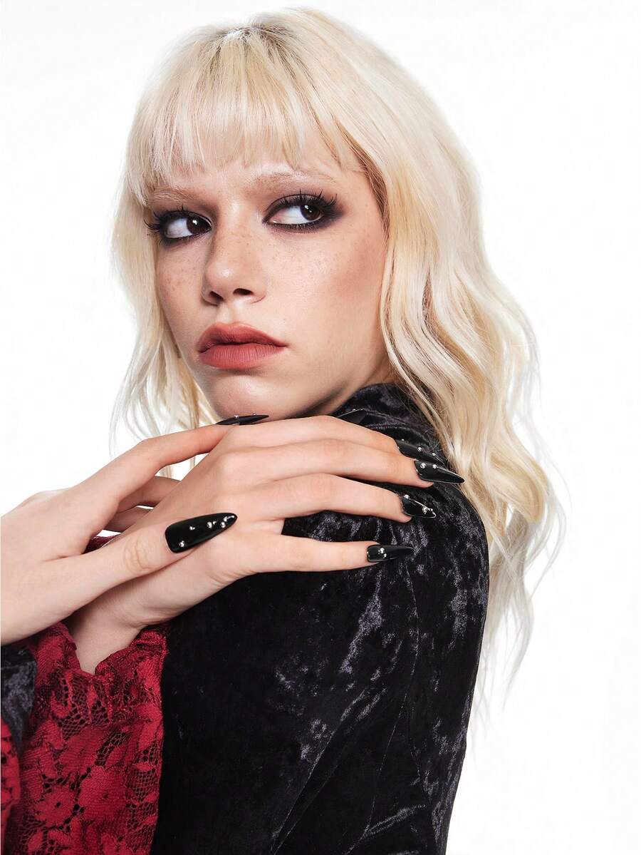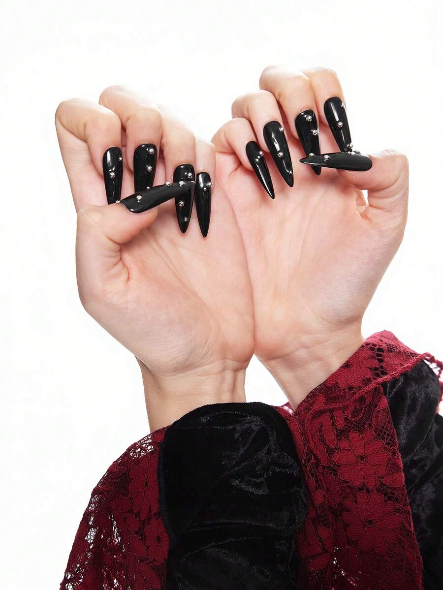 Goth 10 قطعة أظافر صناعية سوداء اللون ذات جودة عالية مصنوعة يدويًا+ 3 شرائط لاصقة الجانب، طراز جوثي Y2K، ملصقات فنون الأظافر القابلة للإزالة وإعادة الاستخدام مزينة بالخرز، مناسبة للاحتفالات والحفلات والرقص والارتداء اليومي