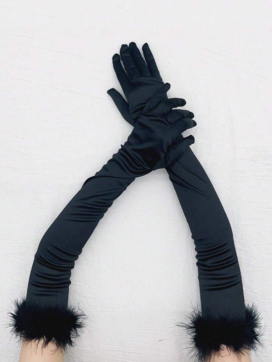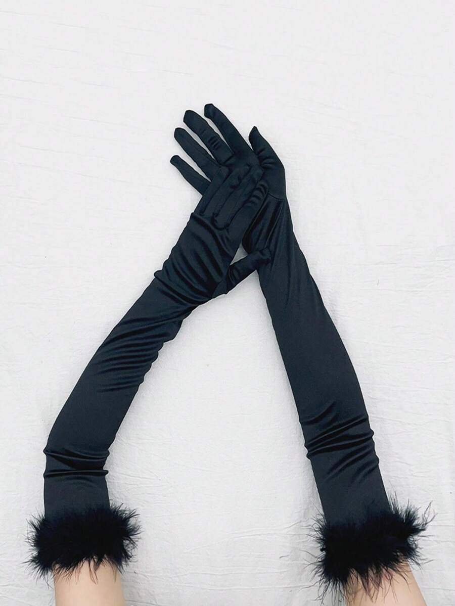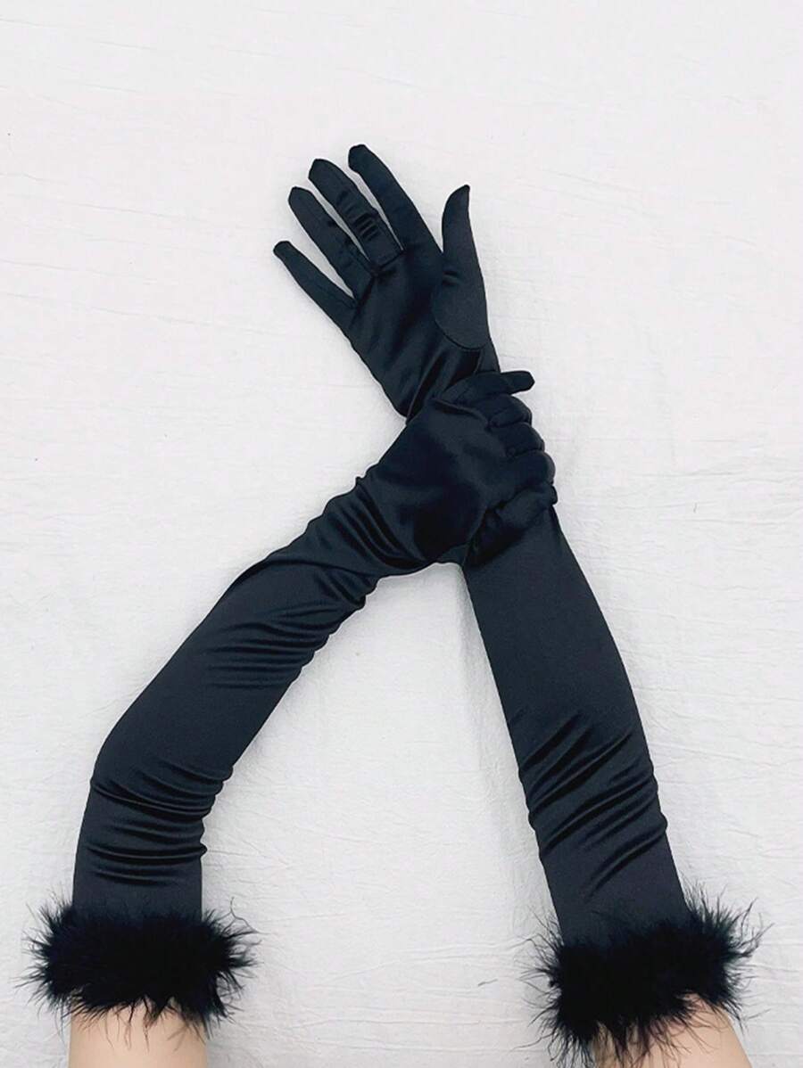 قفازات العروس الطويلة الفينتج الساتان الأسود مزينة بالريش والدانتيل وقفازات المعصم من الستان السبانديكس.
