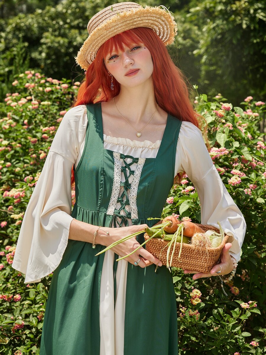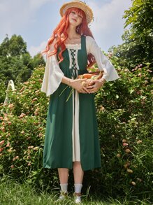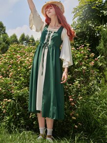 Fairycore فستان بدون أكمام رباط دانتيل متباين اللون قطعة واحدة