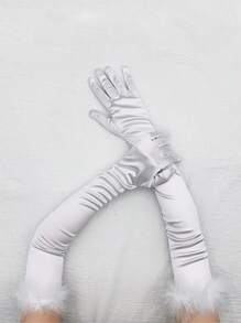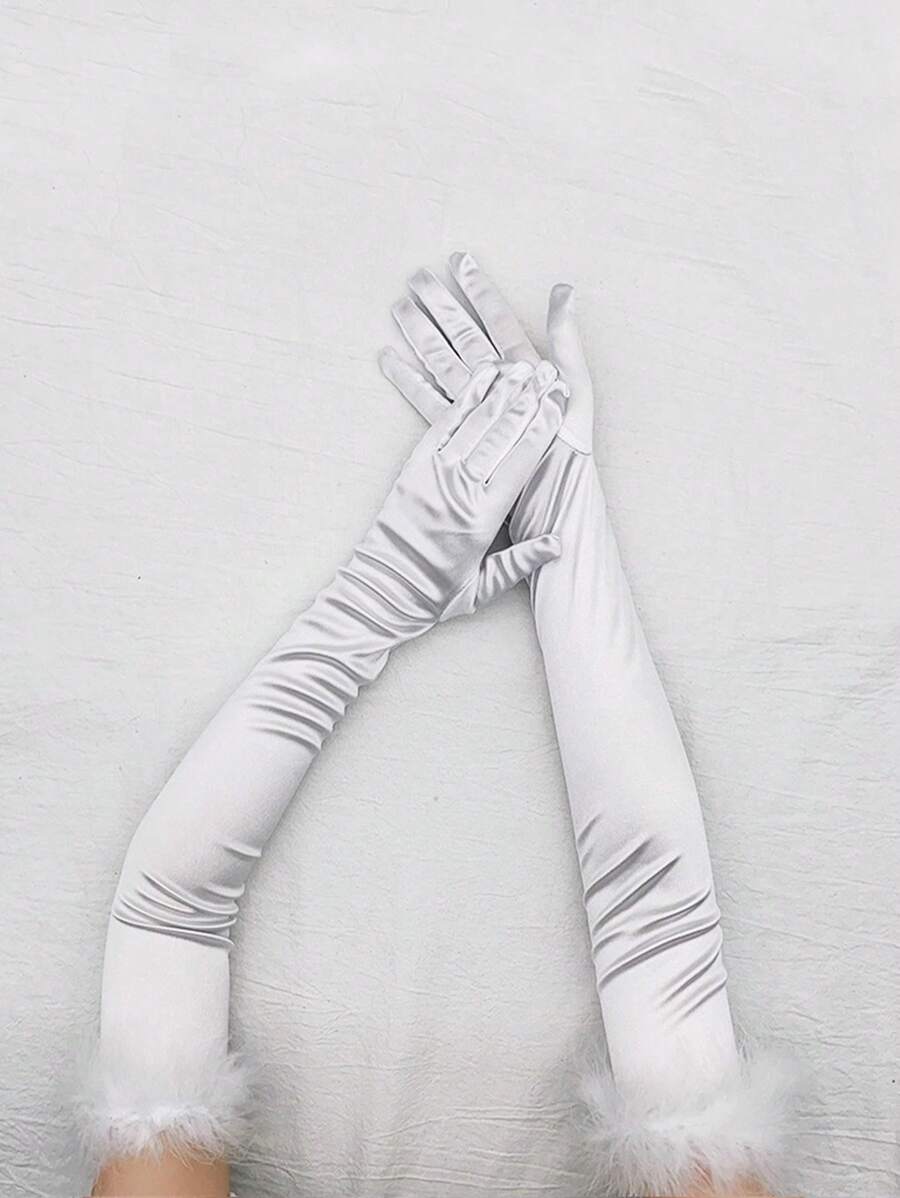 قفازات زفاف طويلة مصنوعة من حرير الساتان الفاخر والريش الأسود والدانتيل مع السباندكس المطاطي