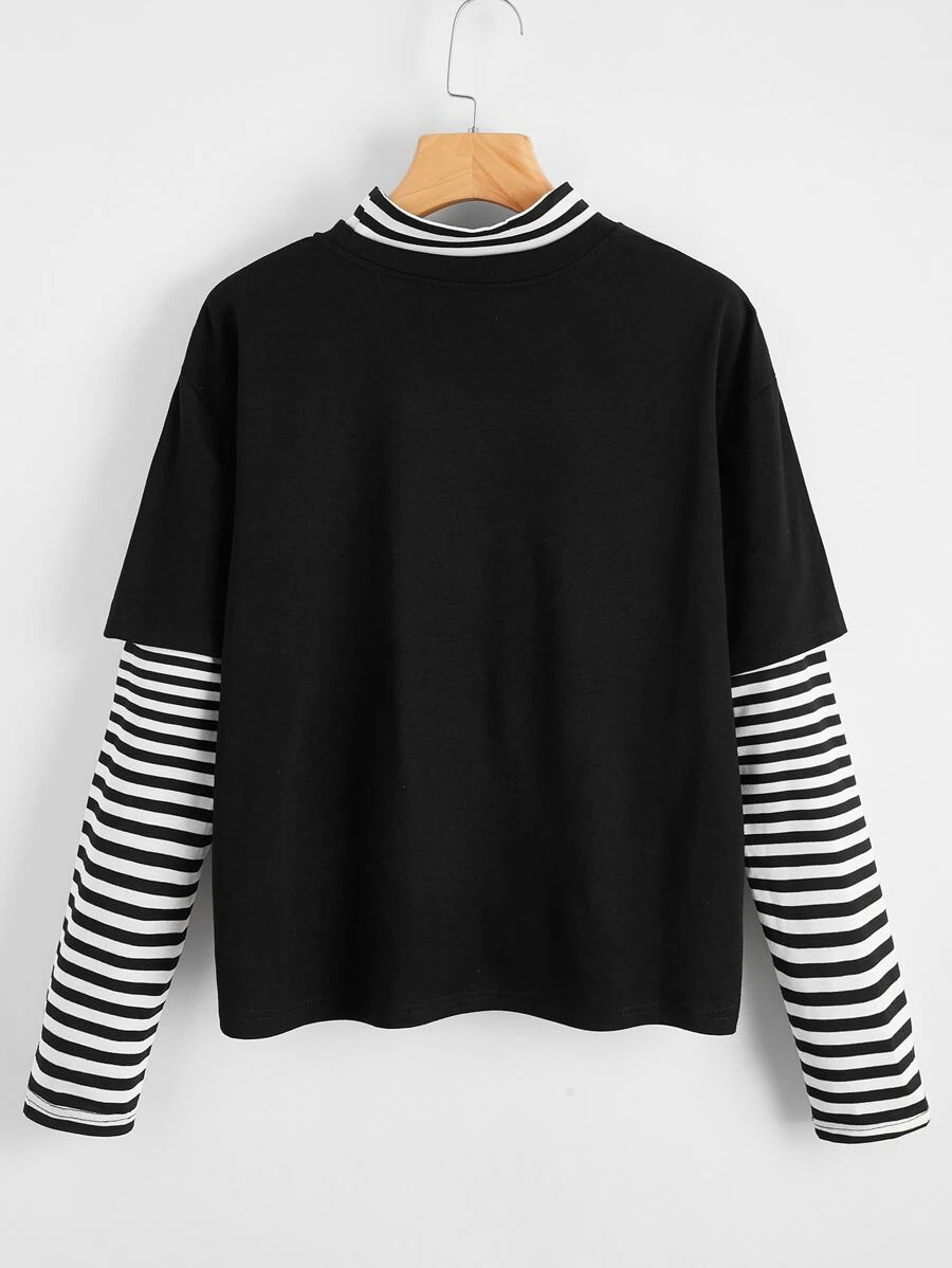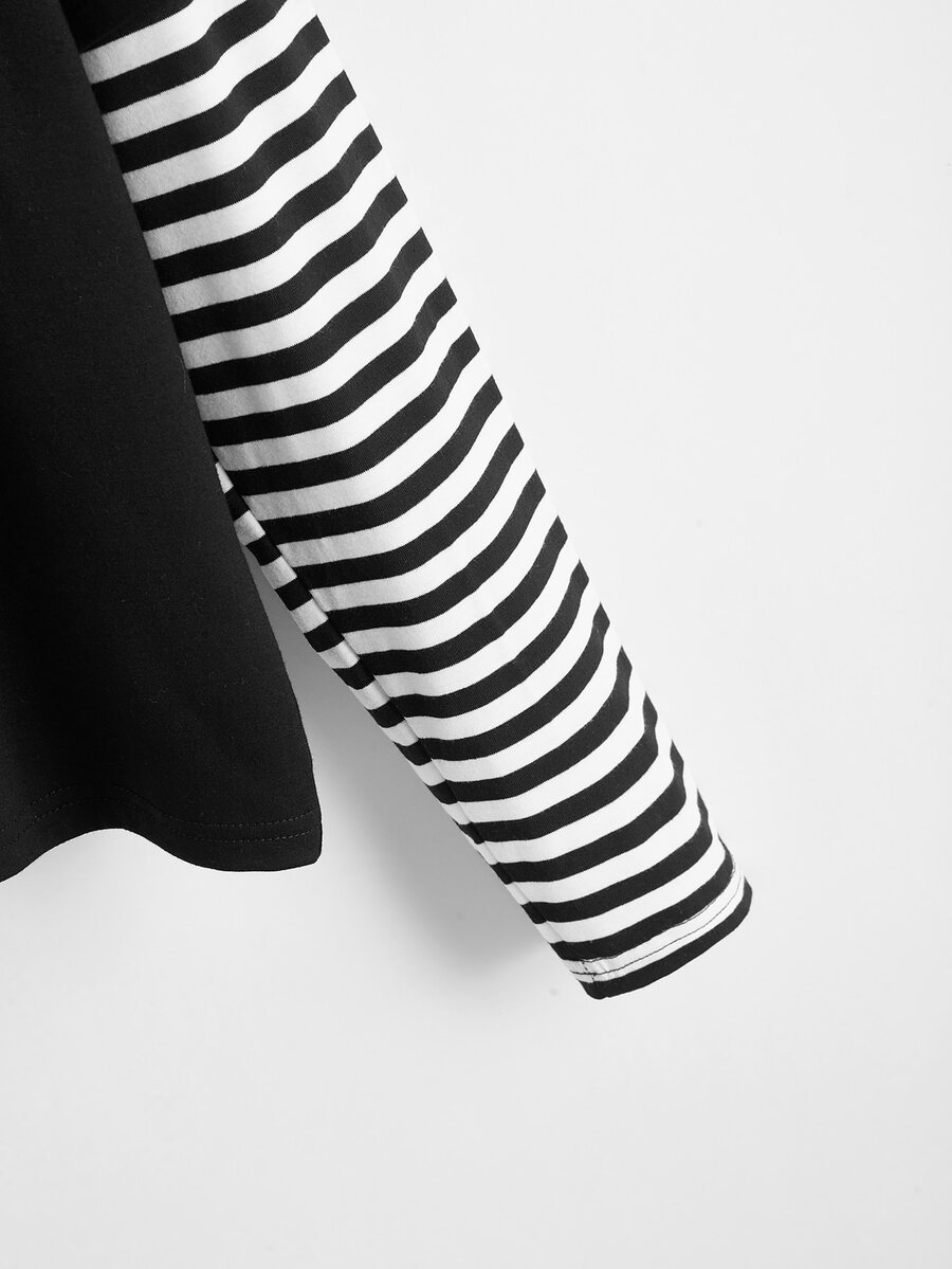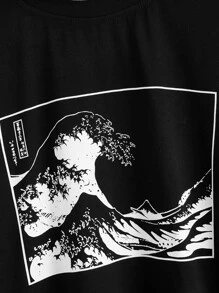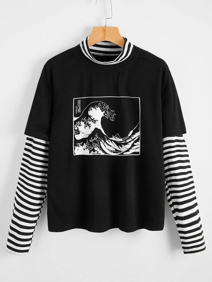 تي شيرت بجرافيك موج وبأكمام مخطط 2 في 1