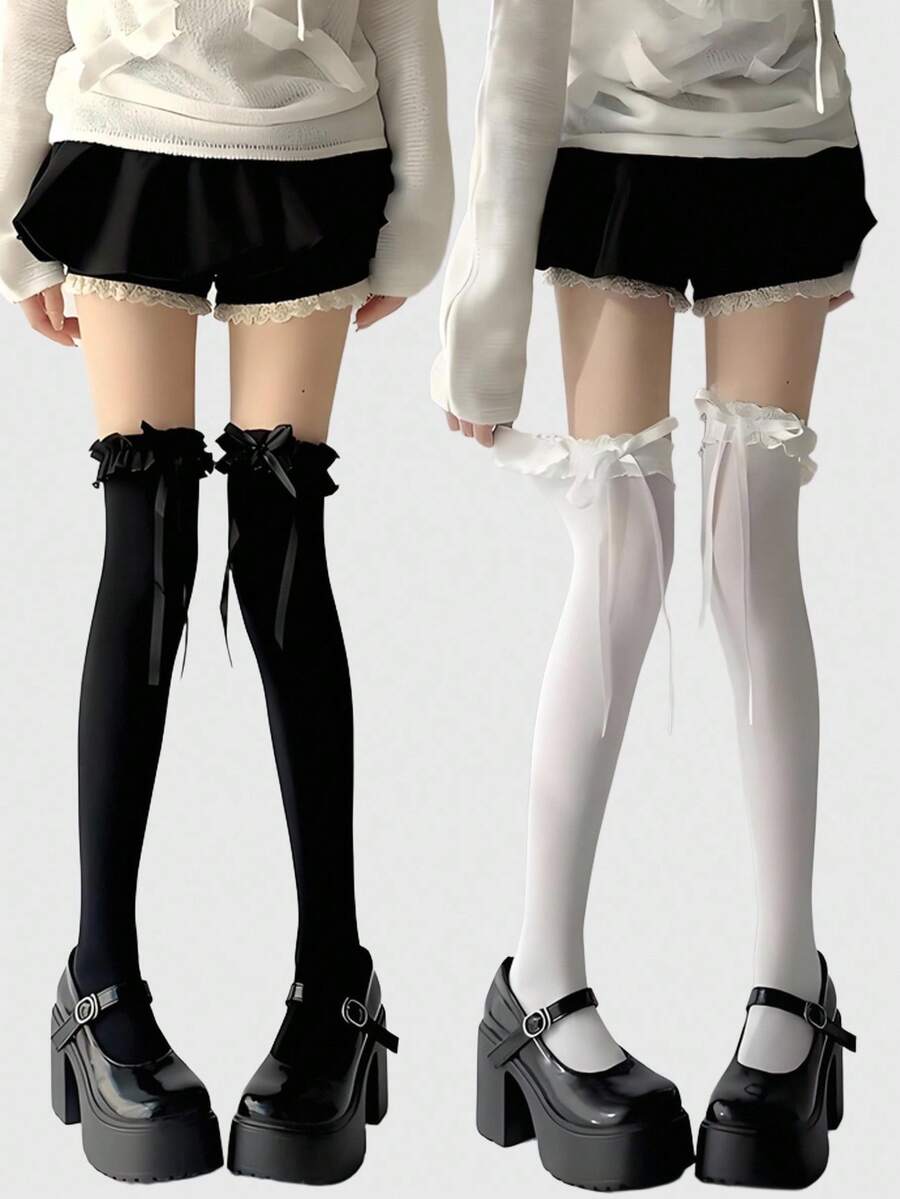 Kawaii زوجان من الجوارب فوق الركبة المزينة بشريط أنيق، بطراز لوليتا باللونين الأسود والأبيض، جوارب طويلة حتى الفخذ بتصميم دانتيل، جوارب شفافة رفيعة جدًا وقابلة للتمدد للاستخدام اليومي