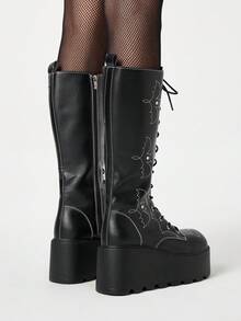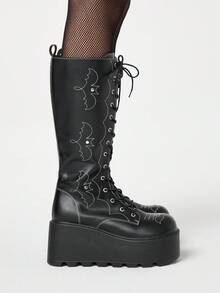 Grunge Punk بوت برباط دائري بنمط بانك ذات كعب سميك وسوله سميكة موديل خريف/شتاء 2025، بوت جلدية للخارج بطراز عصري سهلة الارتداء تصل إلى أعلى الركبة
