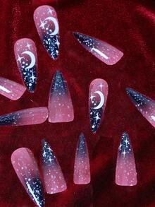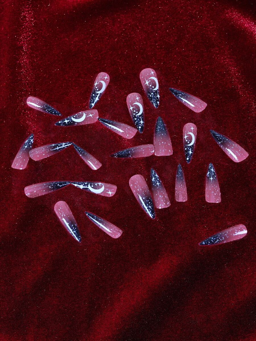 أظافر اصطناعية طويل خنجر نمط قمر ونجم 24 قطعة و شريط ورقة واحدة