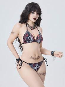 Goth مجموعة بكيني قطعتين للنساء بطراز جوثيك بانك أفانت-جارد، مثير، طبعة صليب وأجنحة ملاك ورد أسود، ربطة عنق، مثلث، أسود/أحمر/بوردو، أنيق رومانسي مثير، مناسب للشاطئ والعطلات والحفلات والاستخدام اليومي