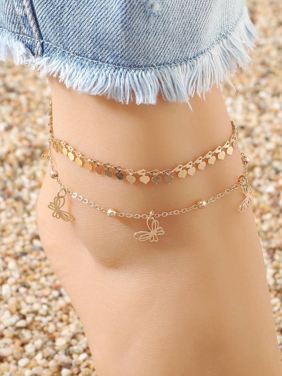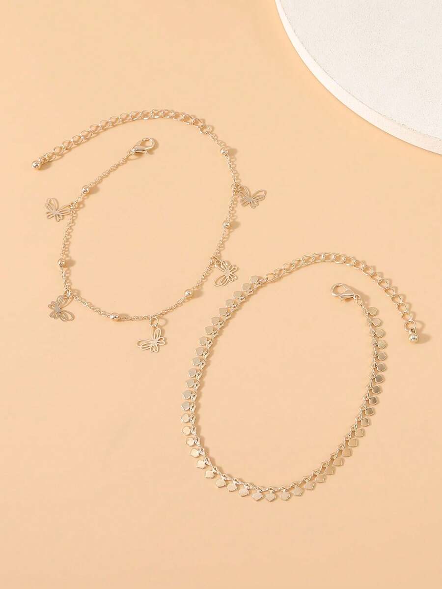 2 مجموعة أساور كاحل ذات شكل قلب جوفي وتصميم فراشة أنيق، مناسبة للنساء، استخدام عادي أو جذاب لشاطئ الصيف أو العطلات