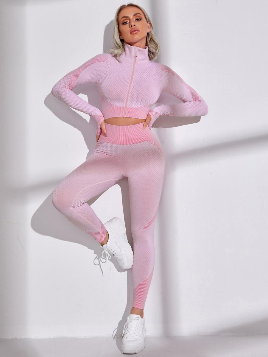 السترات الرياضية عالية التمدد بسحاب علوي وسراويل ضيقة للتحكم في البطن 2 قطعة