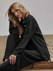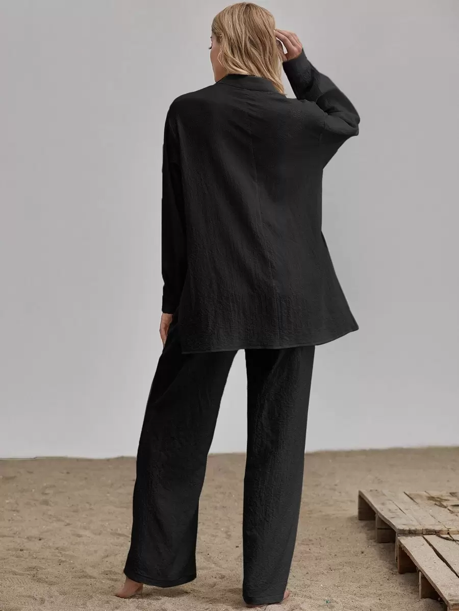طقم بنطلون بساق واسع مع بلوزة طويل بحافة مشقوق