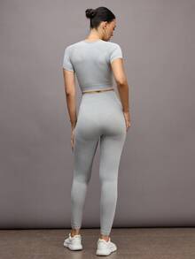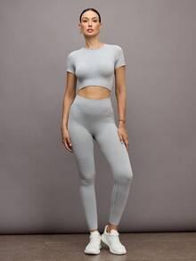 2 قطعة بدلة رياضية نسائية من نوع شمعي سلس عالي المرونة للياقة البدنية والجمباز، تتكون من قطعة علوية بأكمام رجلان وشد البطن وبنطلون ضيق للتمارين