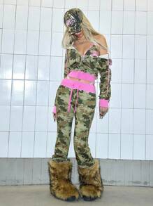 Paul Frank X ROMWE مجموعة بلوزة رياضية وبنطلون رياضي مطرزة بشعار طبعة الكاموفلاج من تعاون الثقافة الفرعية Y2K