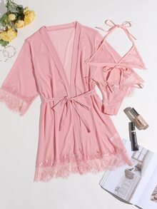 طقم ملابس داخلي لينجري شبكي 3 قطع مع روب مقلم بدانتيل