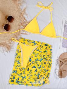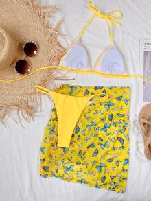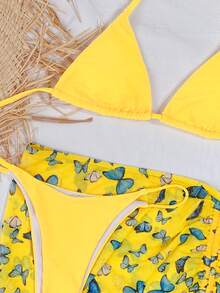 3 طقم بكيني مثلثي وقطعة تنورة مطبوعة فراشة للشاطئ، للعطلات الصيفية