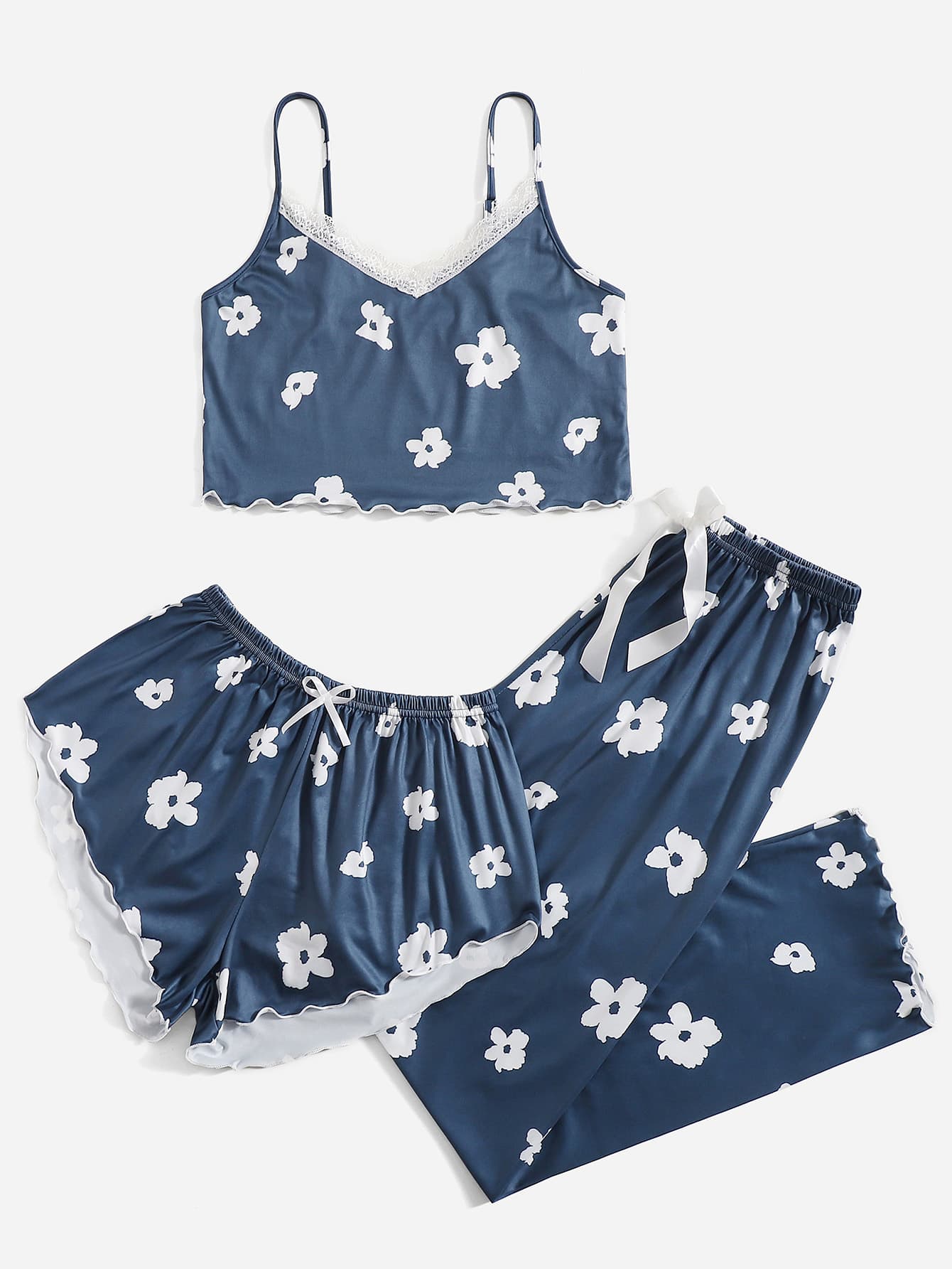3 قطع طباعة الأزهار مقلم دانتيل صدرية كامي مع البنطلون القصير مع بنطلون طقم بيجامة