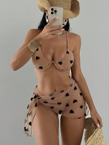 طقم ملابس السباحة المكون من 3قطع، صدرية ذات سلكة طباعة قلب وسروال بيكيني وتنورة تغطية، بدلة سباحة للصيف والشاطئ