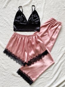 طقم بيجامة ساتان مقلم بدانتيل 3 قطع
