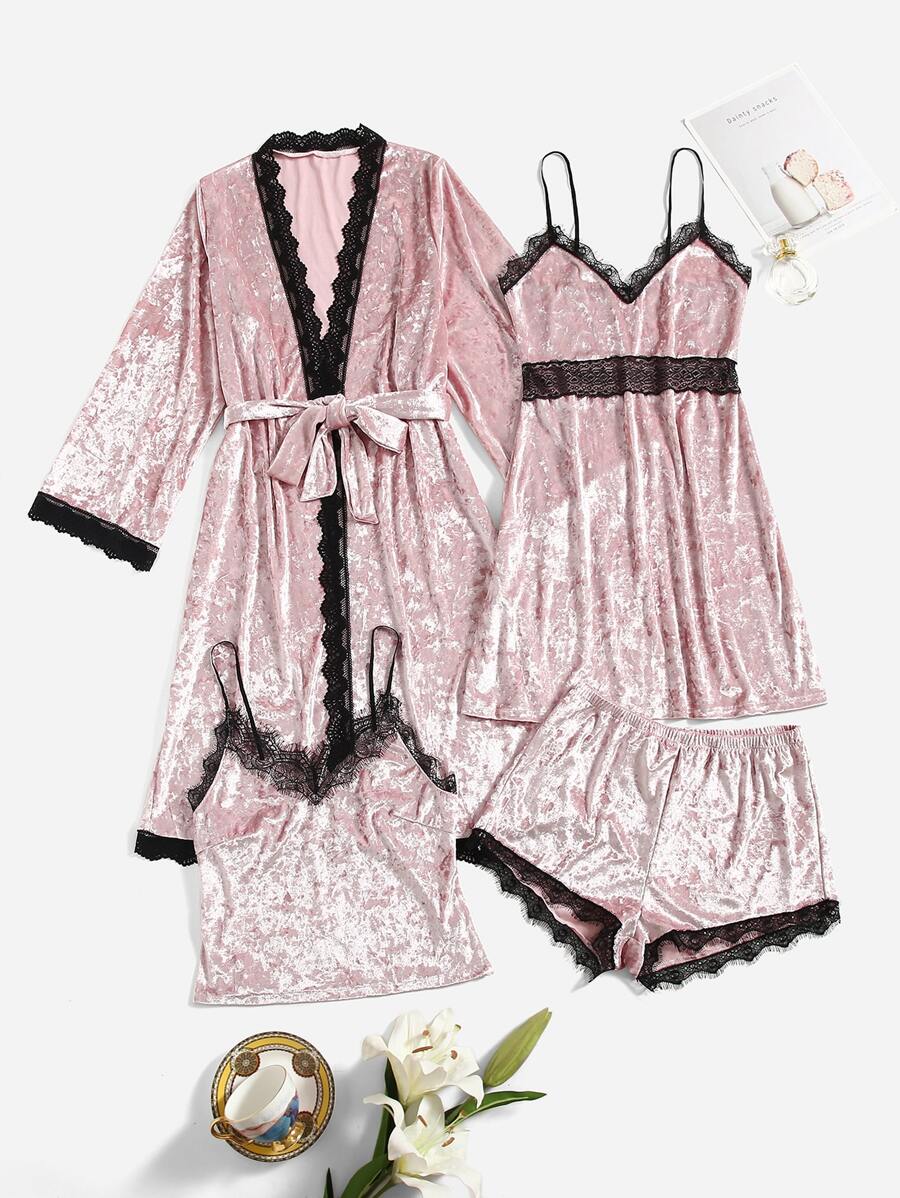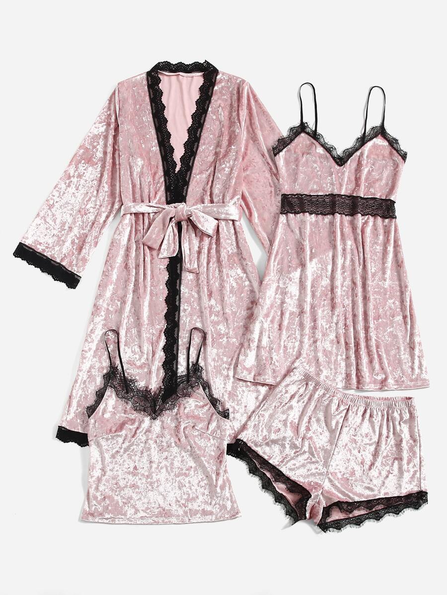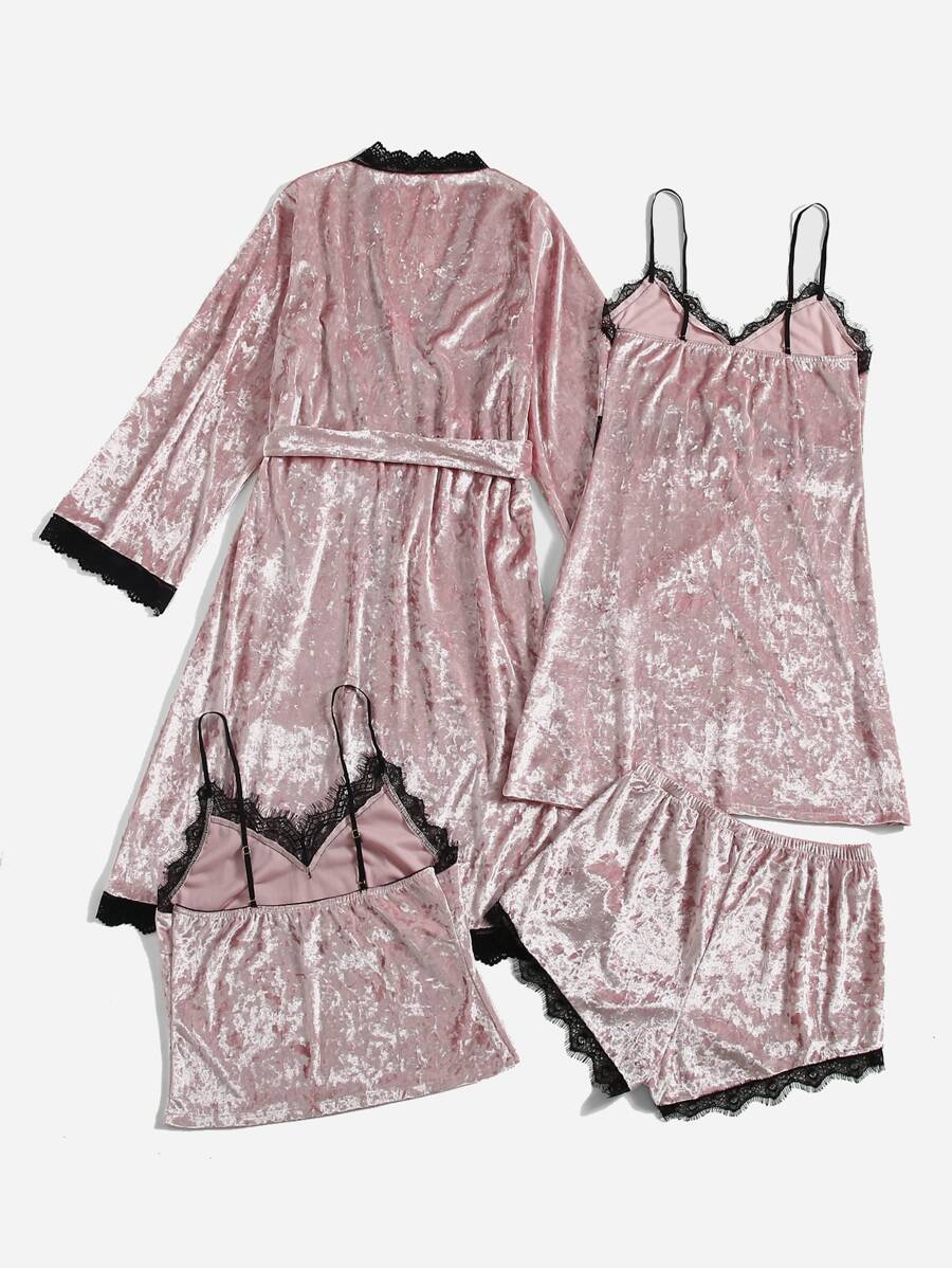 4قطع طقم بيجاما/بدلة نوم من الساتان المخملي بحزام وفتحة رموش متباينة