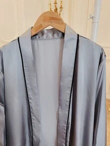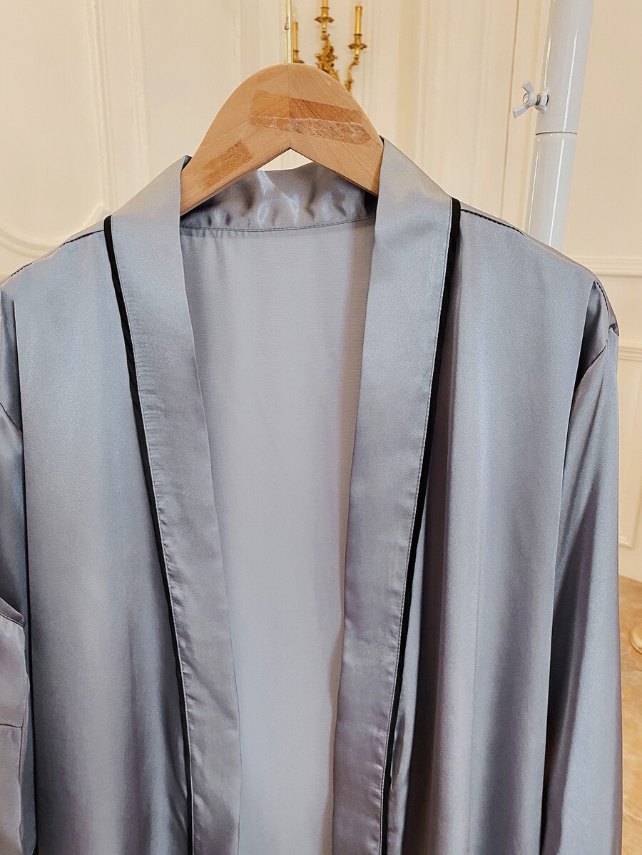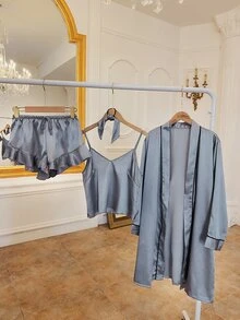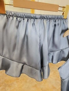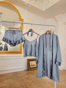 4 قطع حافة مكشكشة معقود من الأمام شريط متباين ساتان طقم بيجامة مع ربطة شعر