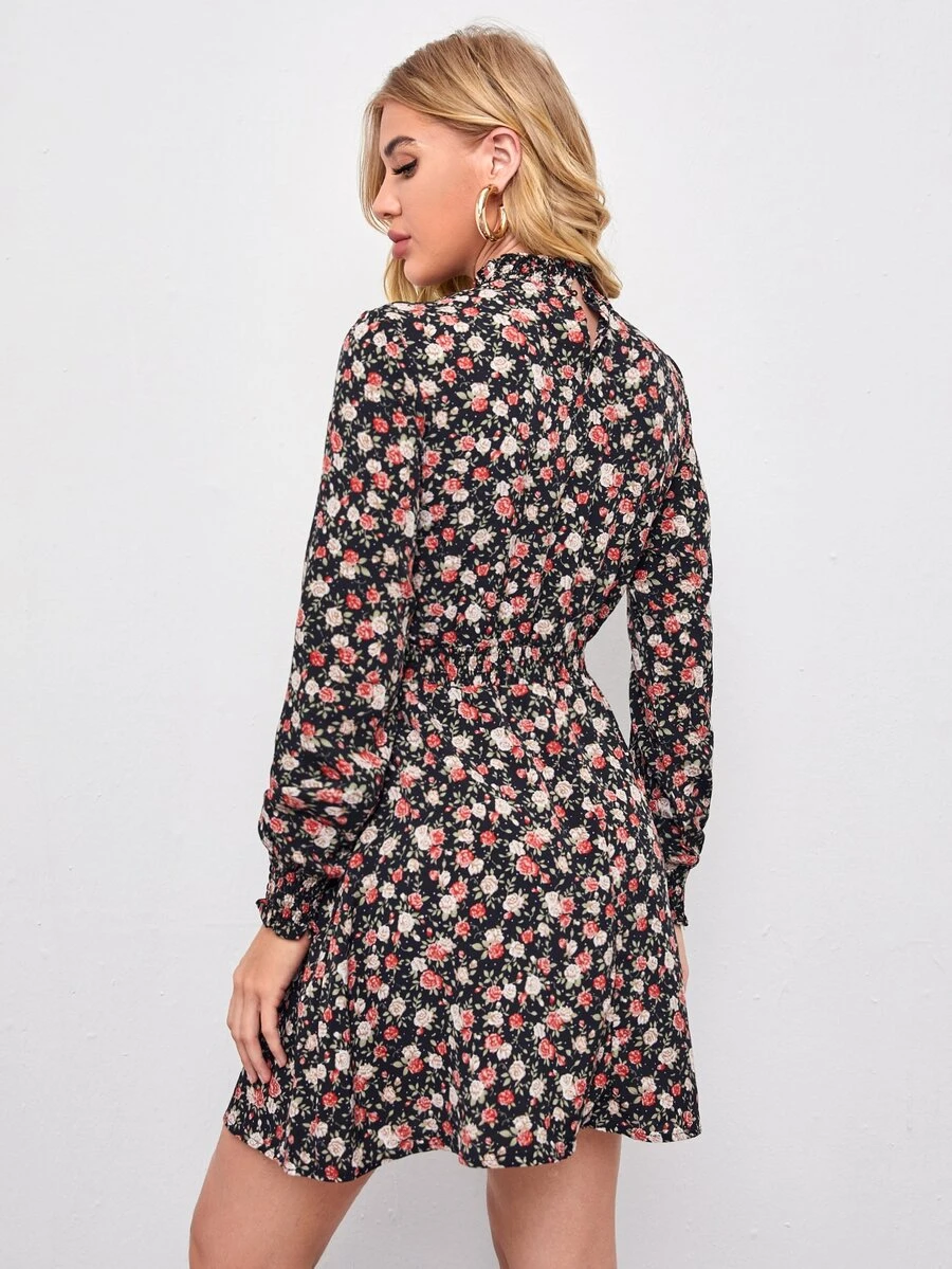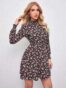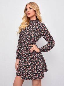 فستان بتفاصيل صوف بعنق مستدير مكشكش وبطباعة زهر شامل