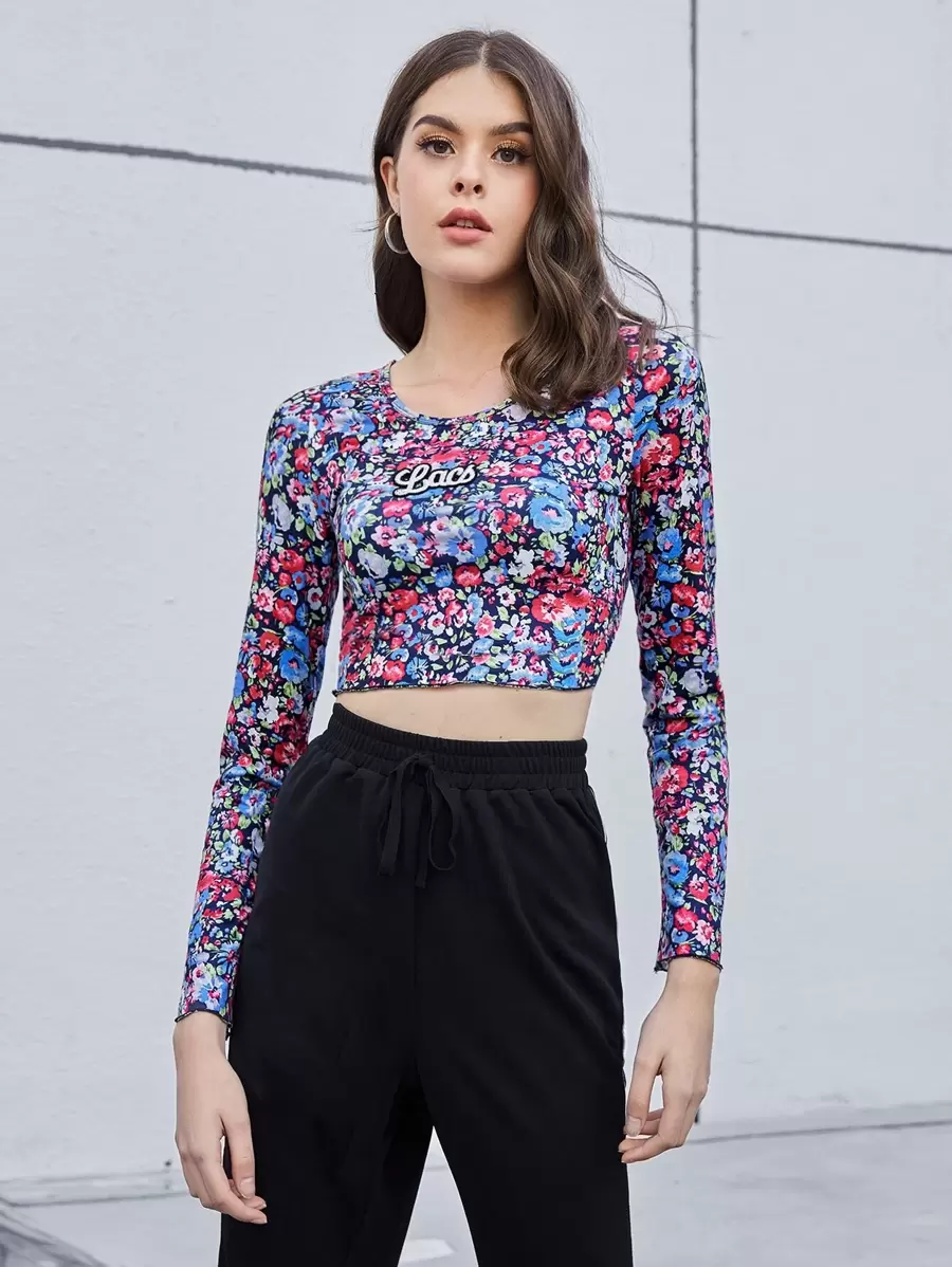 تي شيرت قصير بطباعة زهر شامل تفاصيل مرقع بعبارة