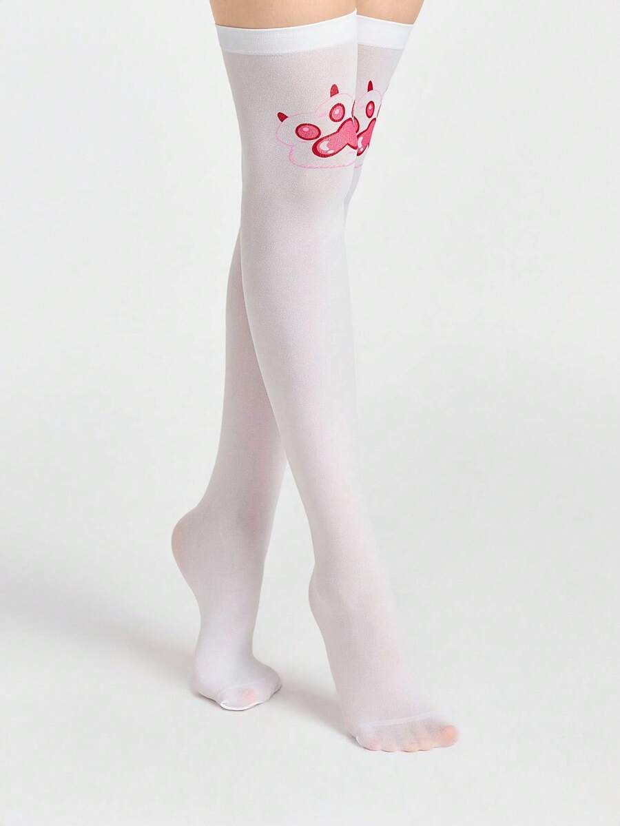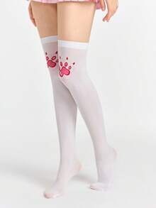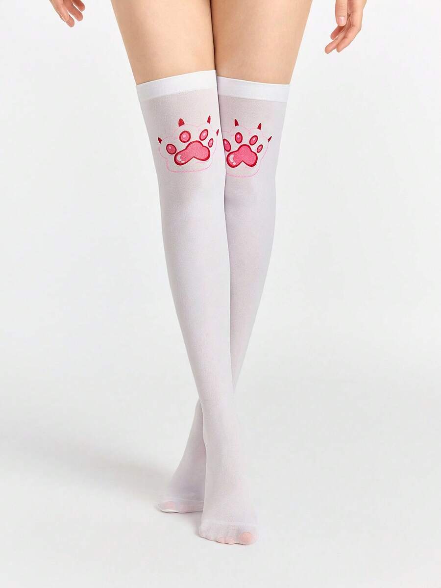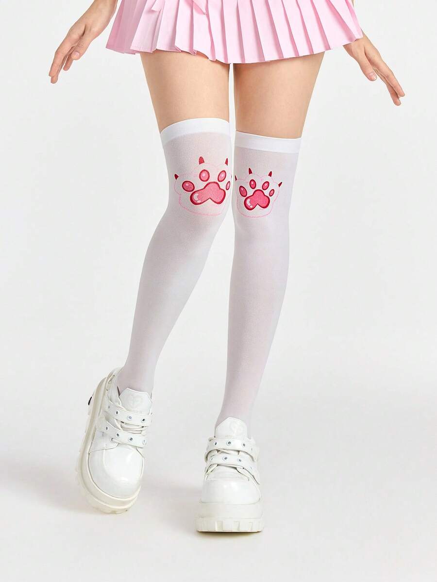 Anime زوج من جوارب عالية الفخذ ذات طبعة طباعة قدم القطة البسيطة الرقيقة، جوارب بيضاء لون أحادي عالية الركبة بأسلوب كلية Y2K، جوارب بنطلون شفافة رقيقة وقابلة للامتداد