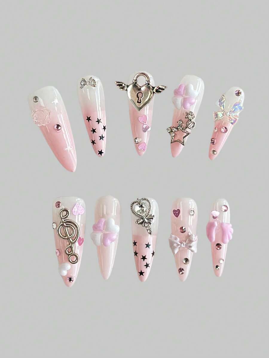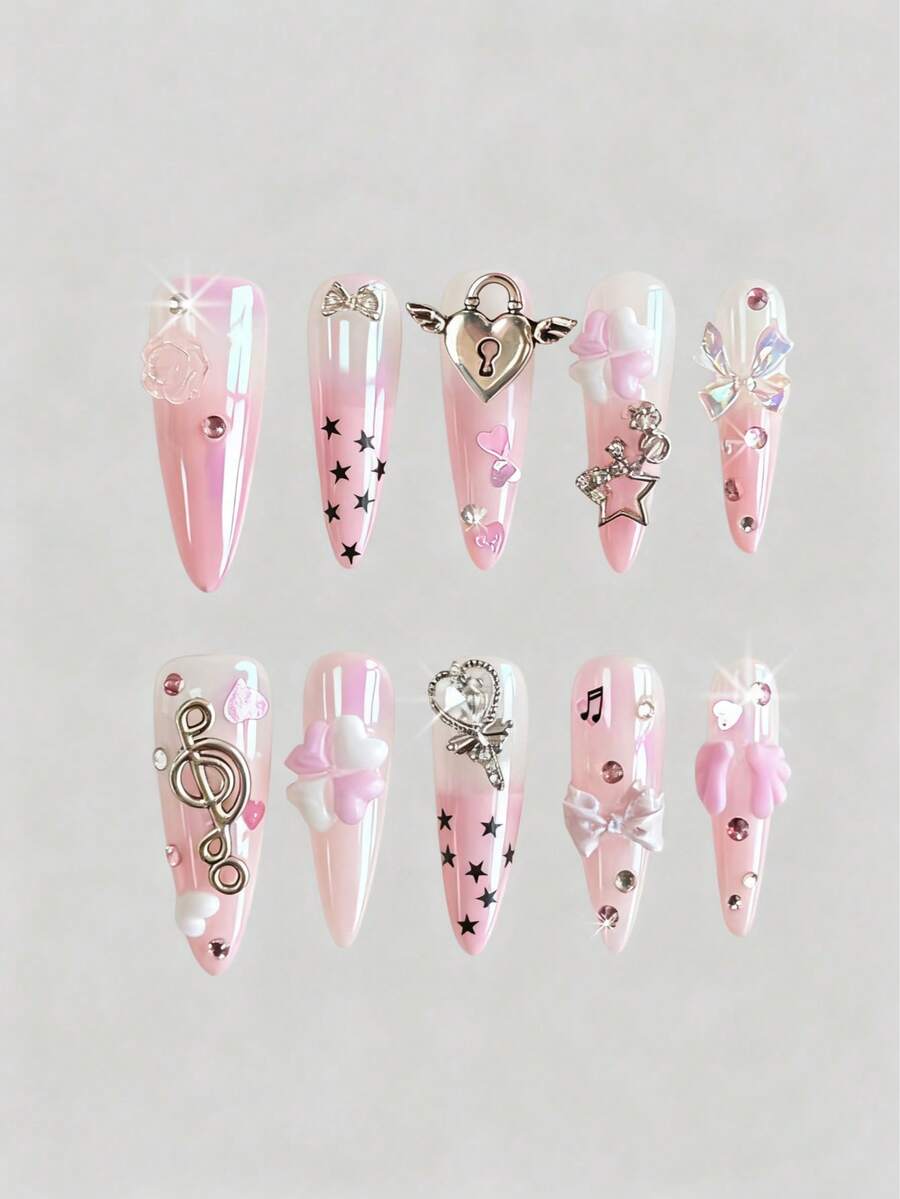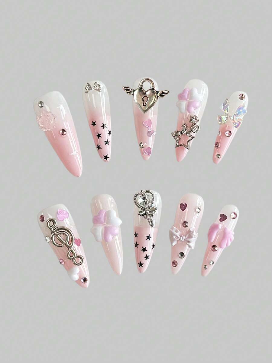 Anime 10 قطعة أظافر مزيفة يدوية الصنع جودة عالية بتصميم فراشة ونغمة موسيقية وعناصر نجمية + 3 قطع لاصق ثنائي الجانب، ملصقات فنية للأظافر بسلسلة من الراين والنقاط على الطراز الفرنسي Y2K قابلة للإزالة، مناسبة للأعياد والحفلات والرقص والاستخدام اليومي