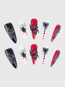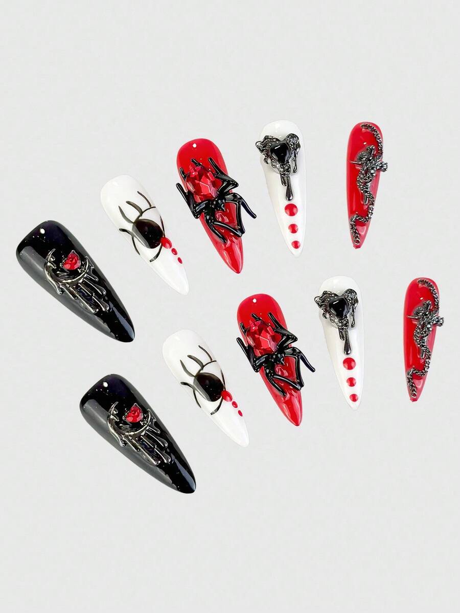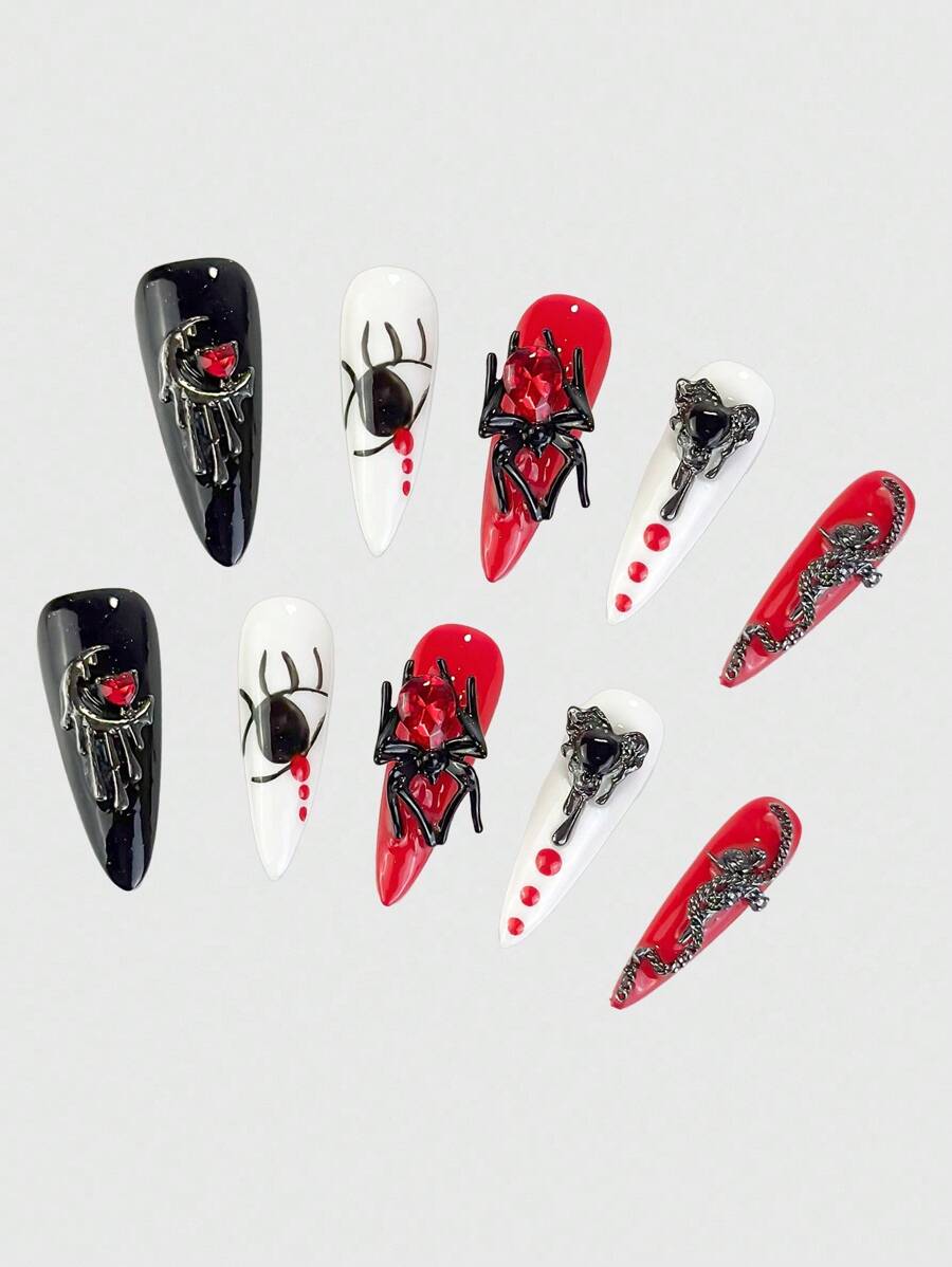 Anime 10 قطعة أظافر صناعية بتصميم عنكبوت سلسلة صليب قمر قلب غريب بطراز جوثيك بانك مع شريط لاصق واحد، للهالوين