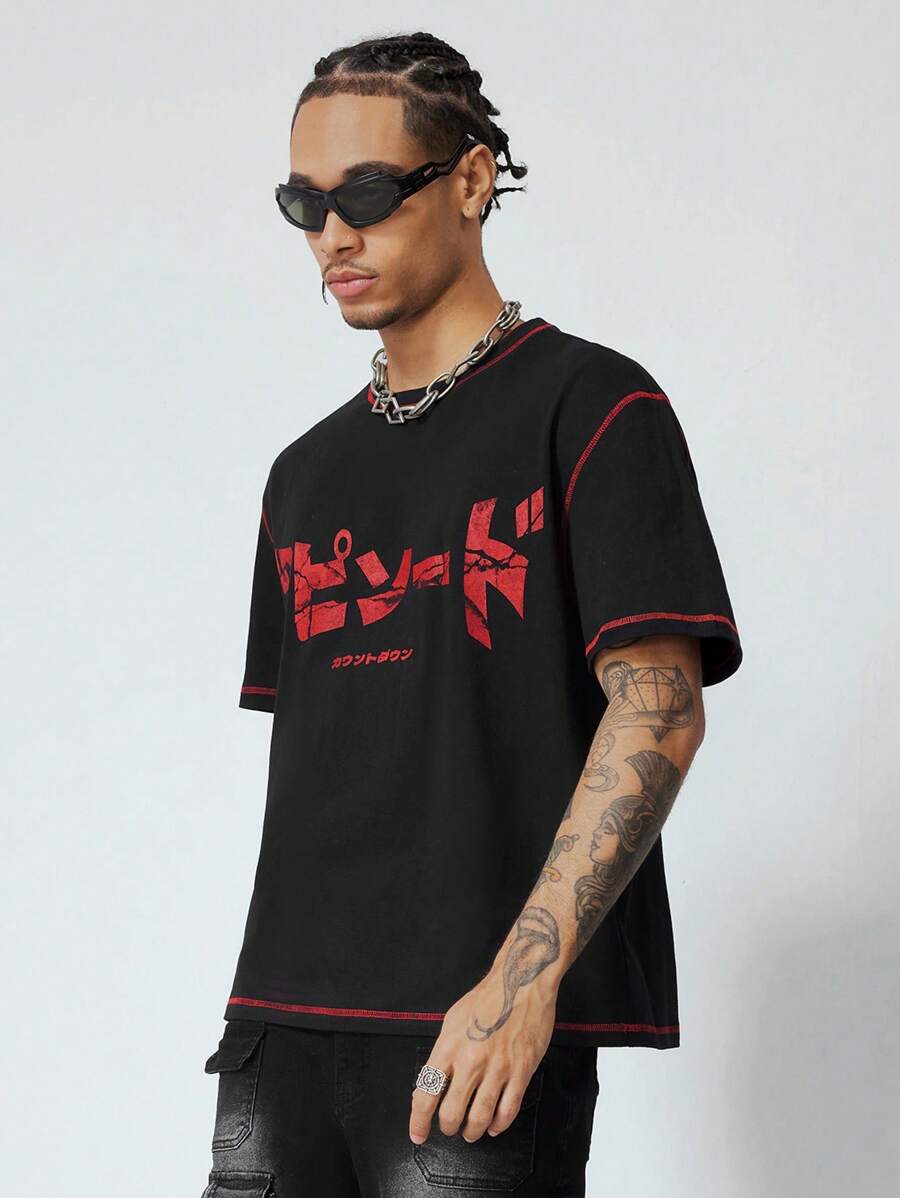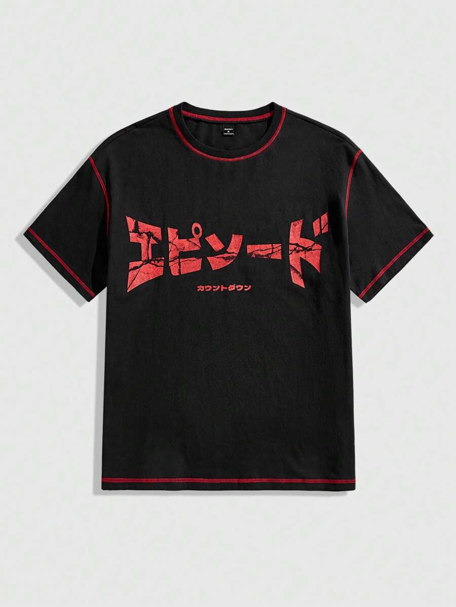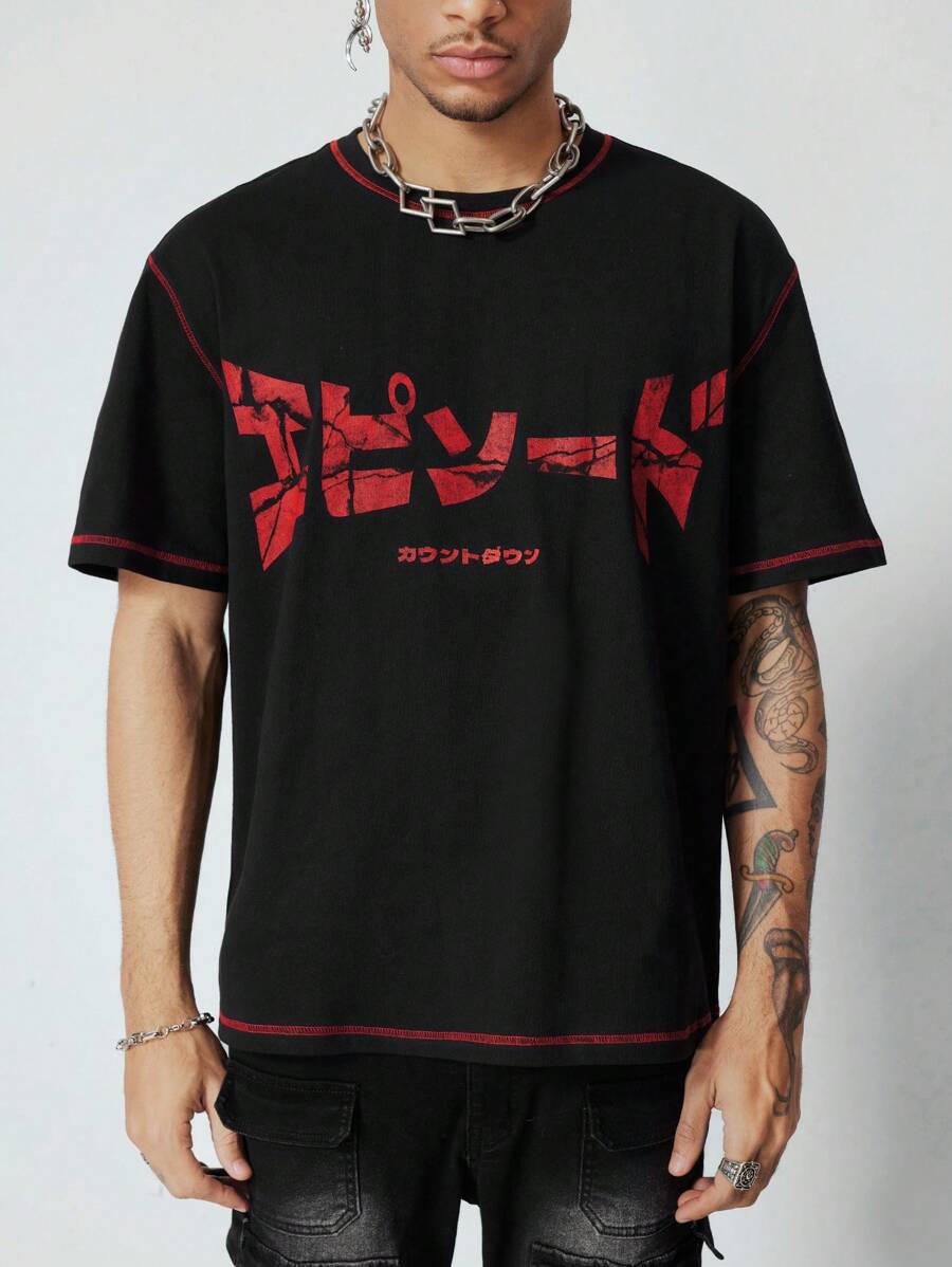 Anime تيشيرت رجالي بطبعة حرفية بياقة دائرية سائب للاستعمال اليومي