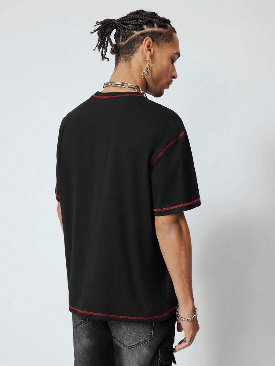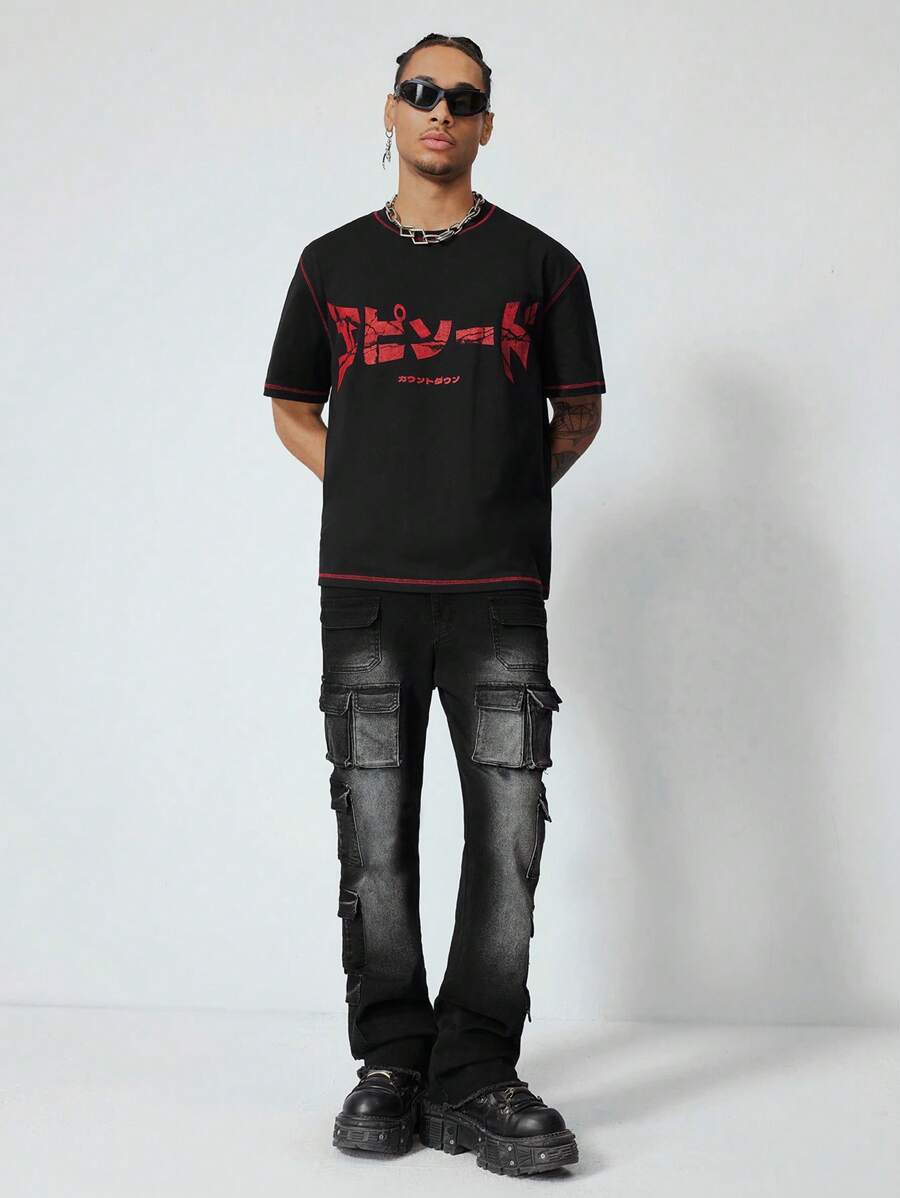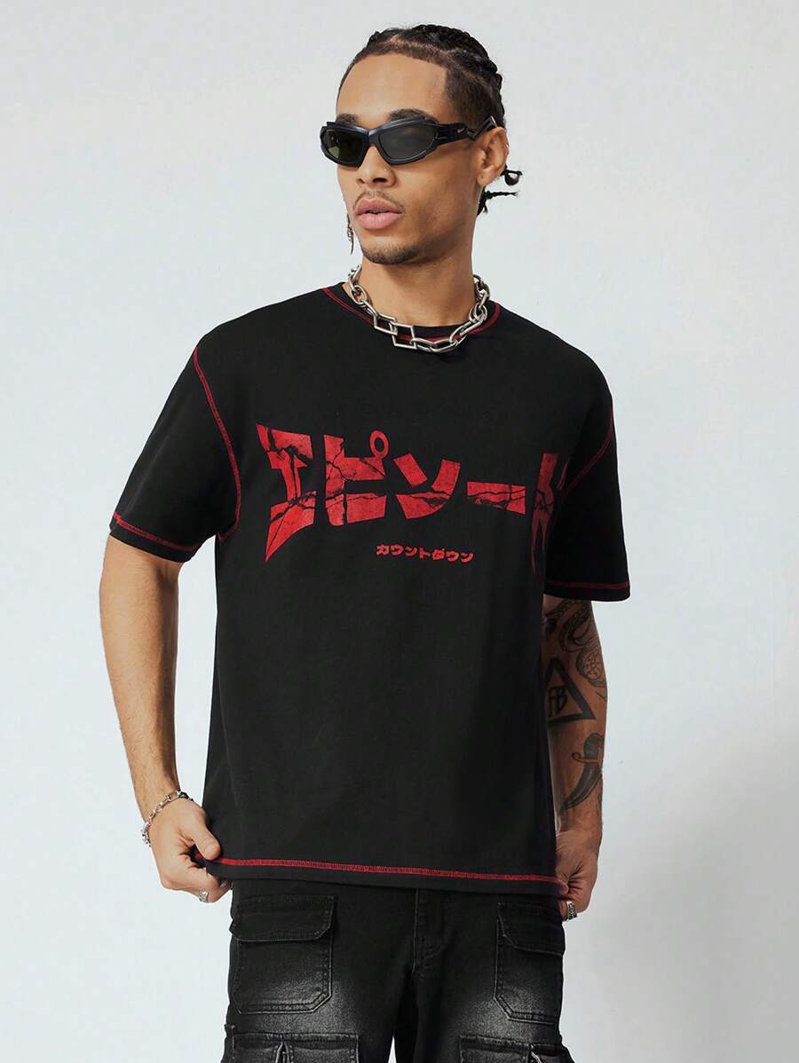 Anime تيشيرت رجالي بطبعة حرفية بياقة دائرية سائب للاستعمال اليومي