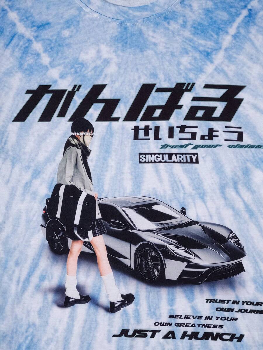Anime تي شيرت قاعدة بيسبول مطبوع بطباعة الناس والسيارة ذو قصة فضفاضة تصميم يابانية باللون المربوط، مناسب للربيع والصيف