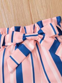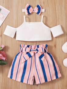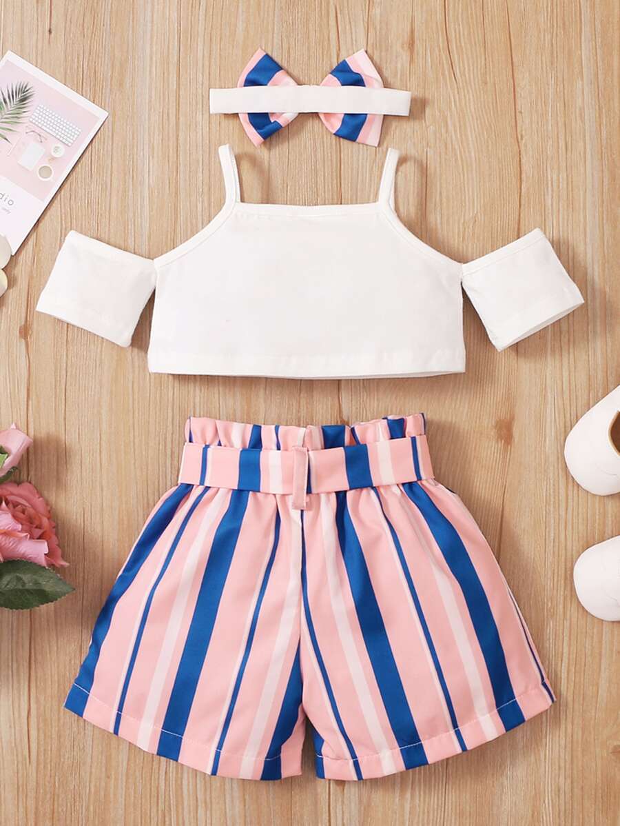 شورت بحزام مخطط مع لباس علوي مكشوف الاكتاف مع عصابة راس للبنات الرضع