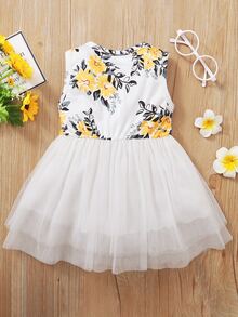 فستان شبكي طبقات بقوس أمامي زهري للبنات الأطفال