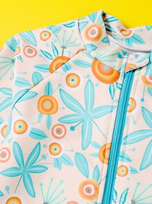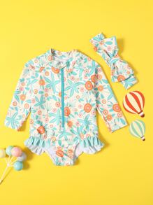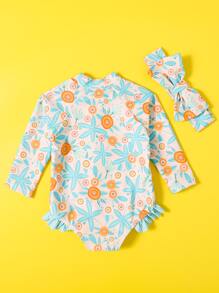 عقال راس مع ملابس سباحة قطعة واحد مكشكشة بجرافيك اوراق الشجر للللبنات للرضع