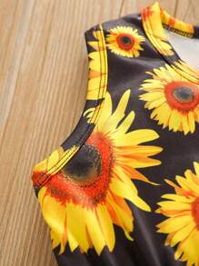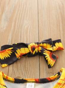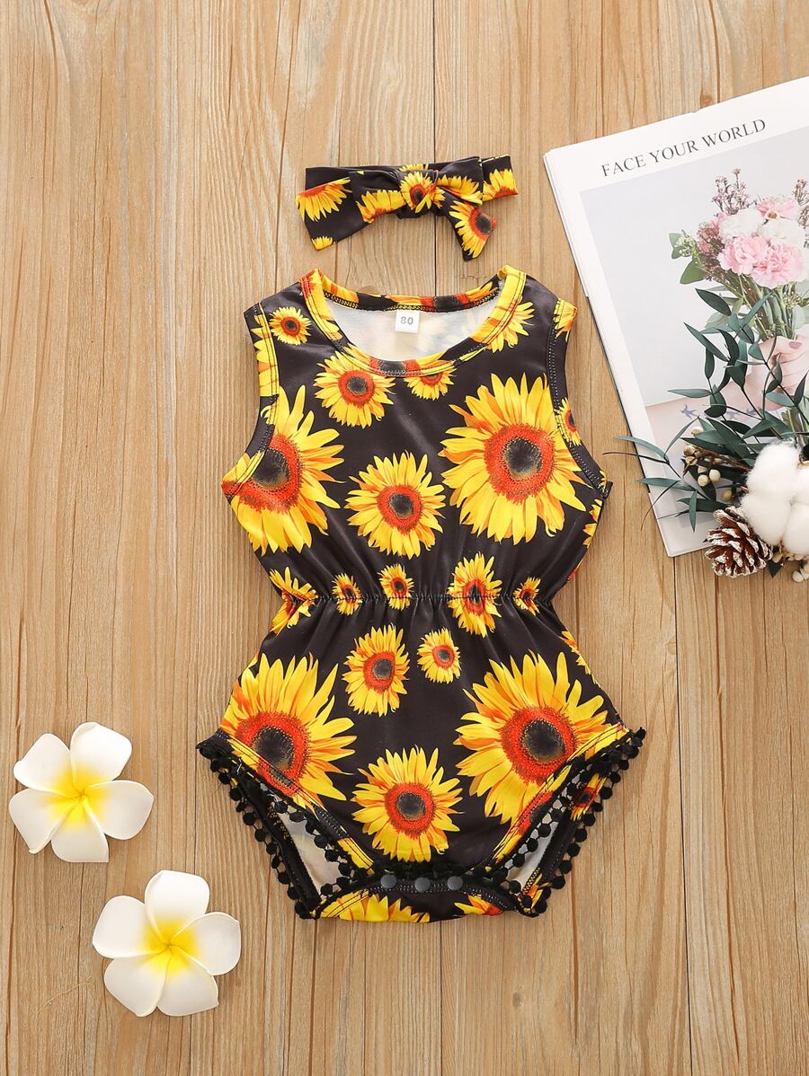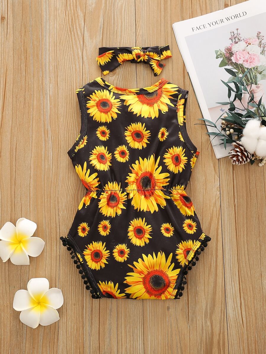 بدسويت بإدخال دانتيل بطباعة زهرة دوار الشمس مع عصابة راس للبنات الرضع