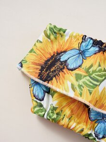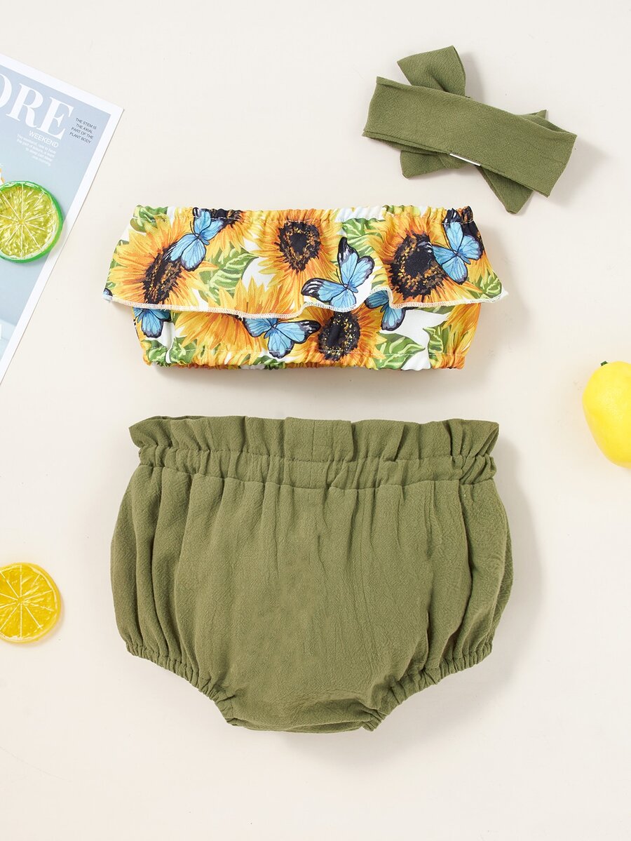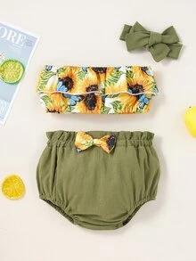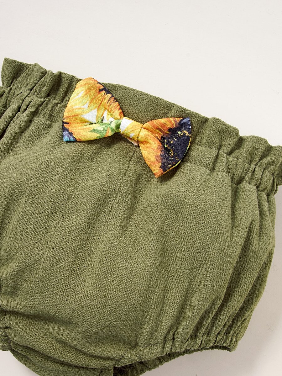 سروال قصير بخصر جيب ورقي مع لباس علوي توب بطباعة زهرة دور الشمس مع عصابة راس للبنات الرضع