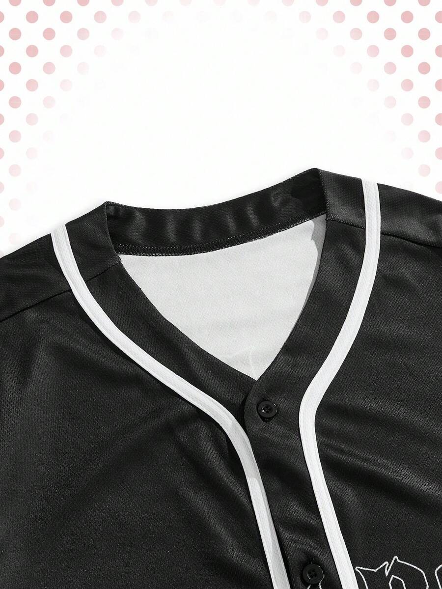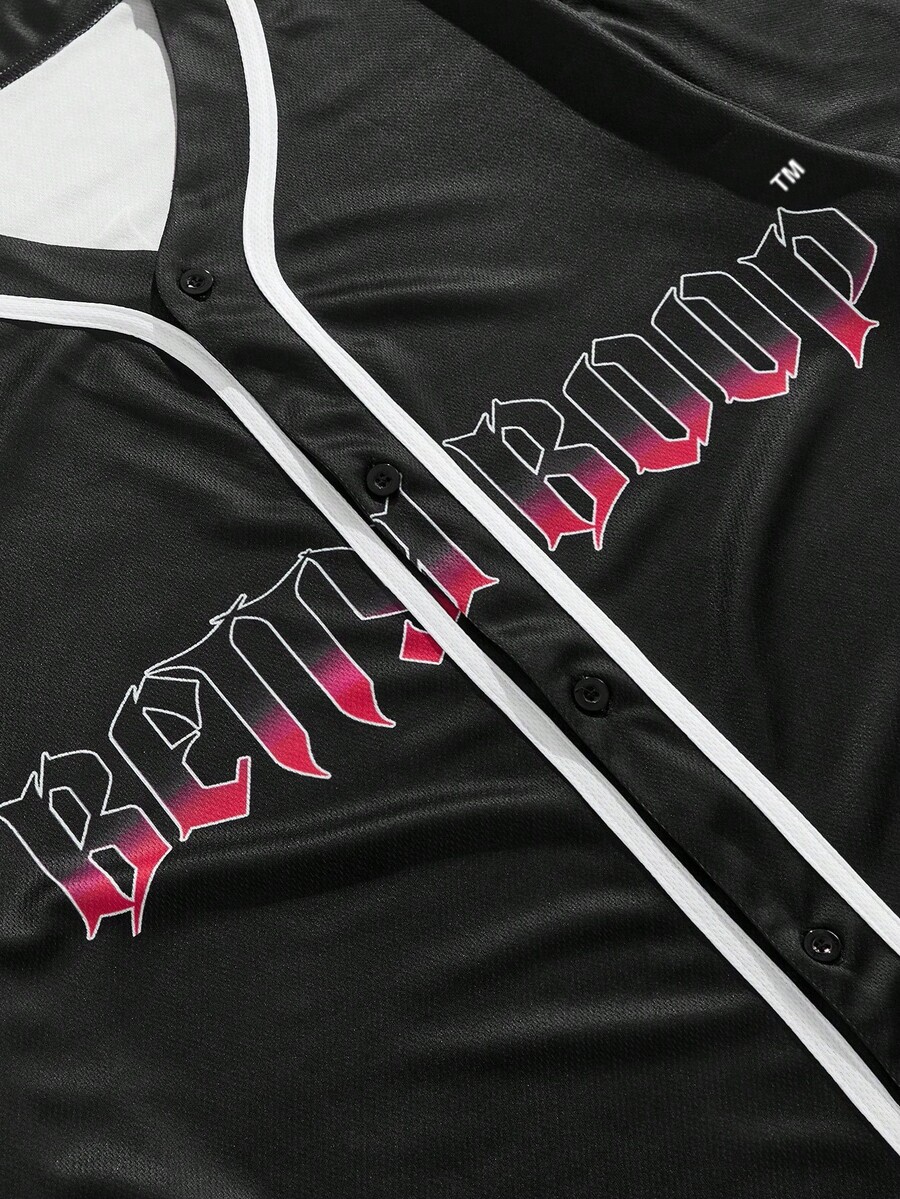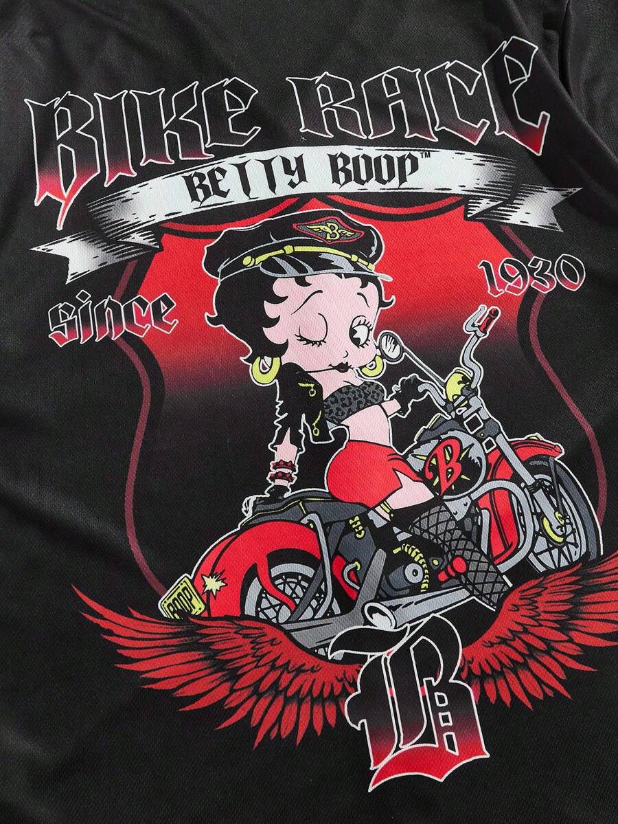 Betty Boop | ROMWE ملابس علوية رجالي مخصص وأنيق: ملابس علوية أسود بطراز البيسبول مطبوع بطباعة الدراجات النارية بياقة على شكل حرف V وأزرار