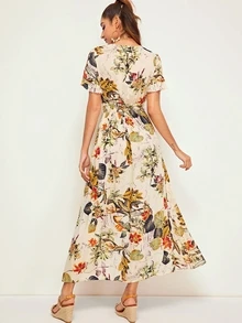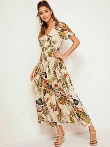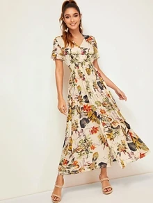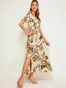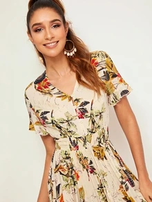 فستان بأزرار امامية وبخصر مجمع بطباعة النباتات