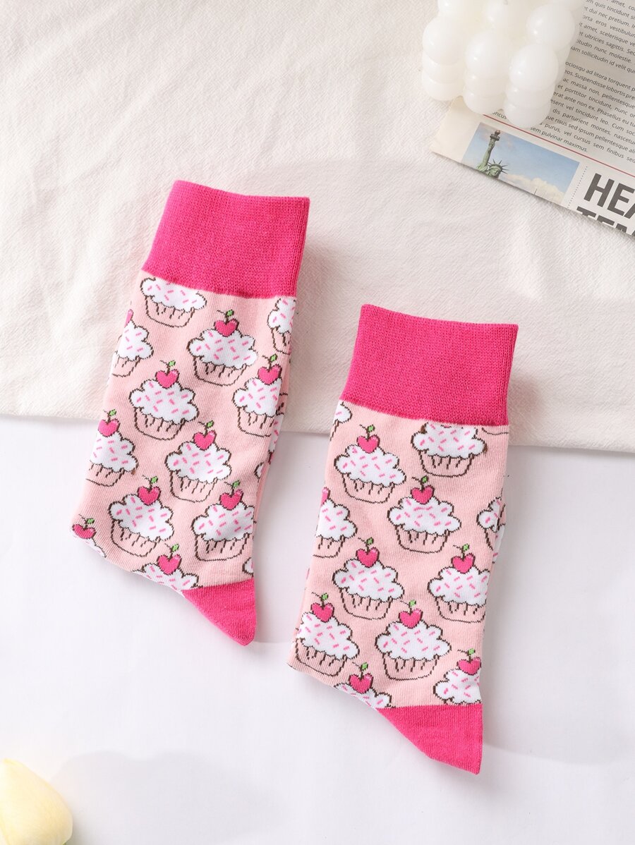 زوج جوارب نسائية بنمط الكب كيك الجميلة، للبنات المدرسيات على الطراز الكاجوال للاستخدام اليومي، جوارب متوسطة الطول