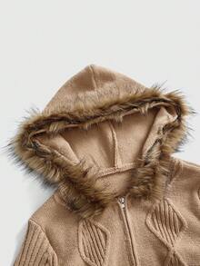 Fairycore كارديجان محبوك بياقة من الفرو المزيف ذو قبعة للنساء، جاكيت محبوكة بتصميم ملفوف كابل قصير مزود بسحاب ضيق، مناسب للخريف والشتاء