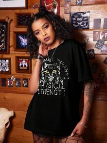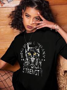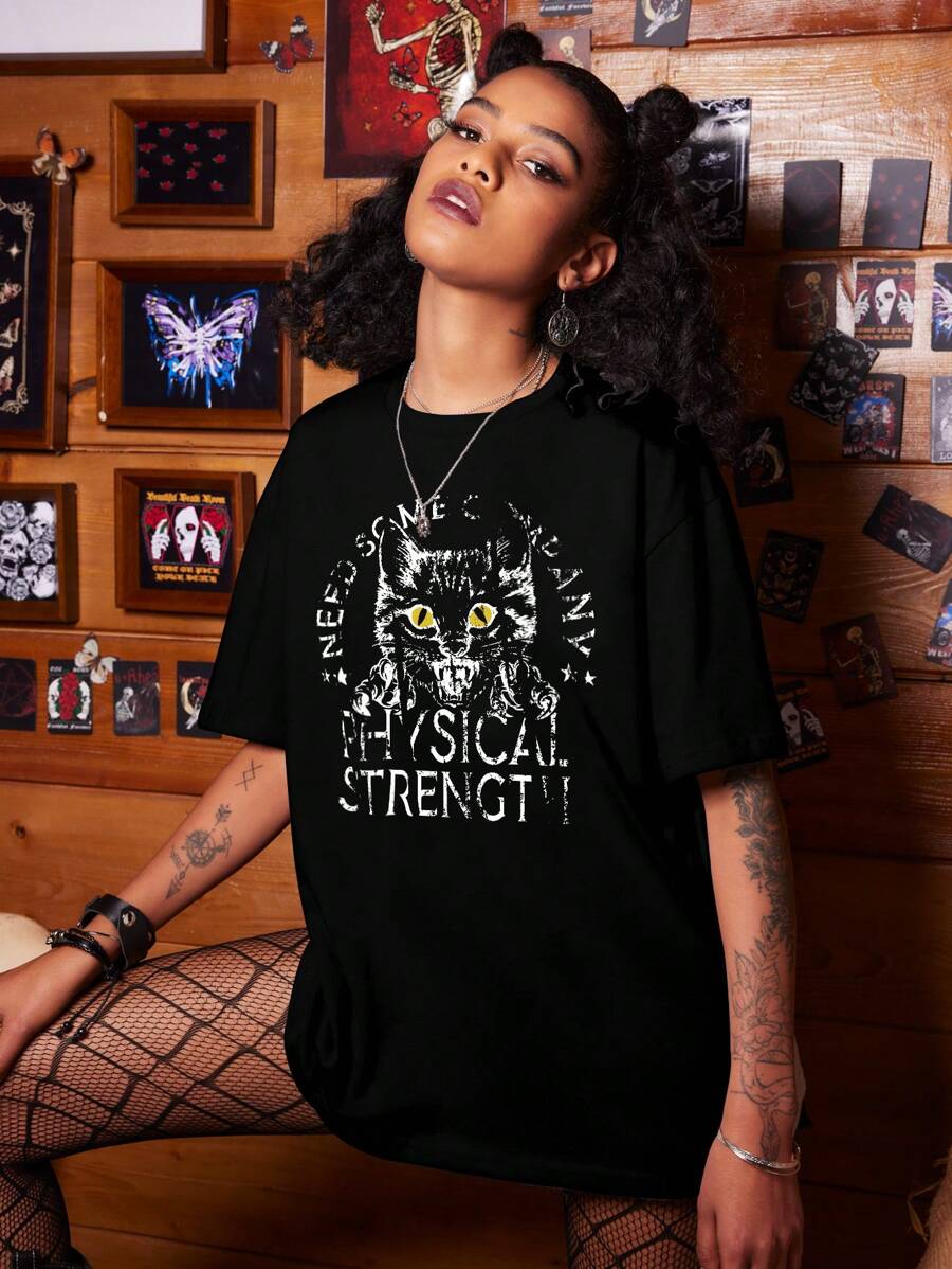 تي شيرت منخفض الاكتاف بجرافيك شعار وقط