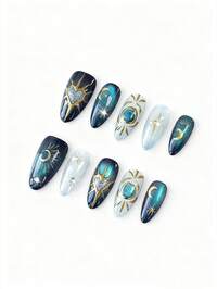 Fairycore 10 قطعة أظافر مزيفة مرسومة باليد بنجوم وقمر + 3 قطع لاصق ثنائي الجانب، أظافر فنية بشكل اللوز قابلة للإزالة عالية الجودة مزينة بحجر الراين والعين القطة اللون، مناسبة للمناسبات والأعياد والاستخدام اليومي
