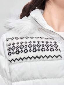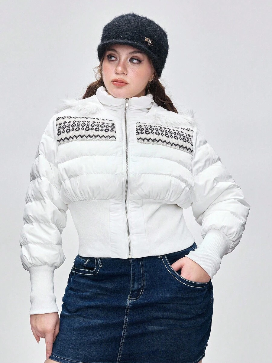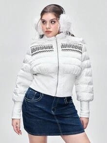 Kawaii معطف مبطن قصير مصنوع من قماش مخرم مع طوق من الفرو الاصطناعي وقلنسوة للمقاسات الكبيرة