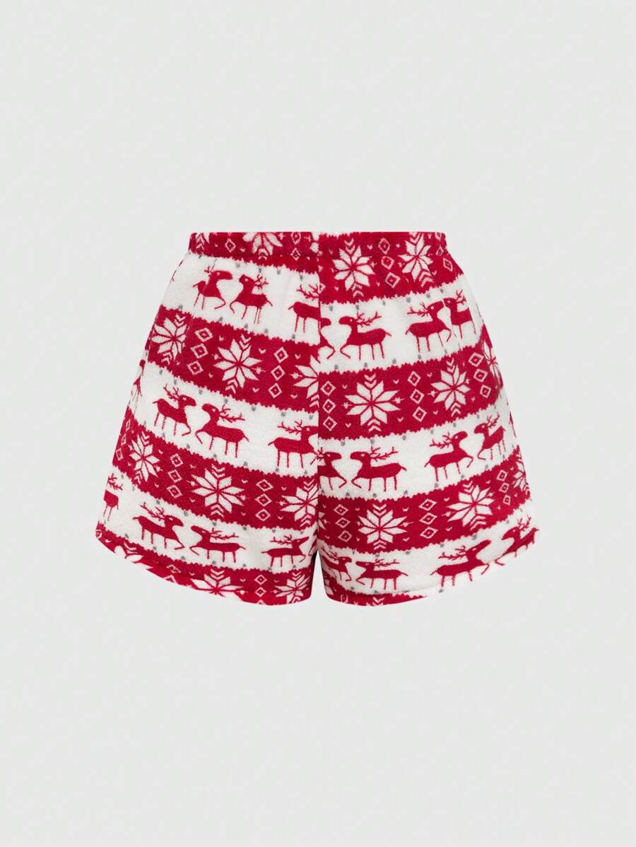 مجموعة بيجاما لون أبيض مكونة من ملابس علوية أكمام بلا و شورت من الفرو الناعم للاستخدام في عيد الميلاد