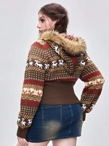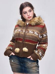 Hippie كارديجان مقصر مزود بقلنسوة للنساء ذوات الحجم الكبير بنمط الأيرلندي الأسطوري للأيائل مع تطريز الشراريب، بطراز عيد الميلاد الفينتاج