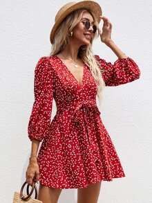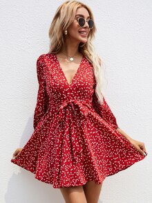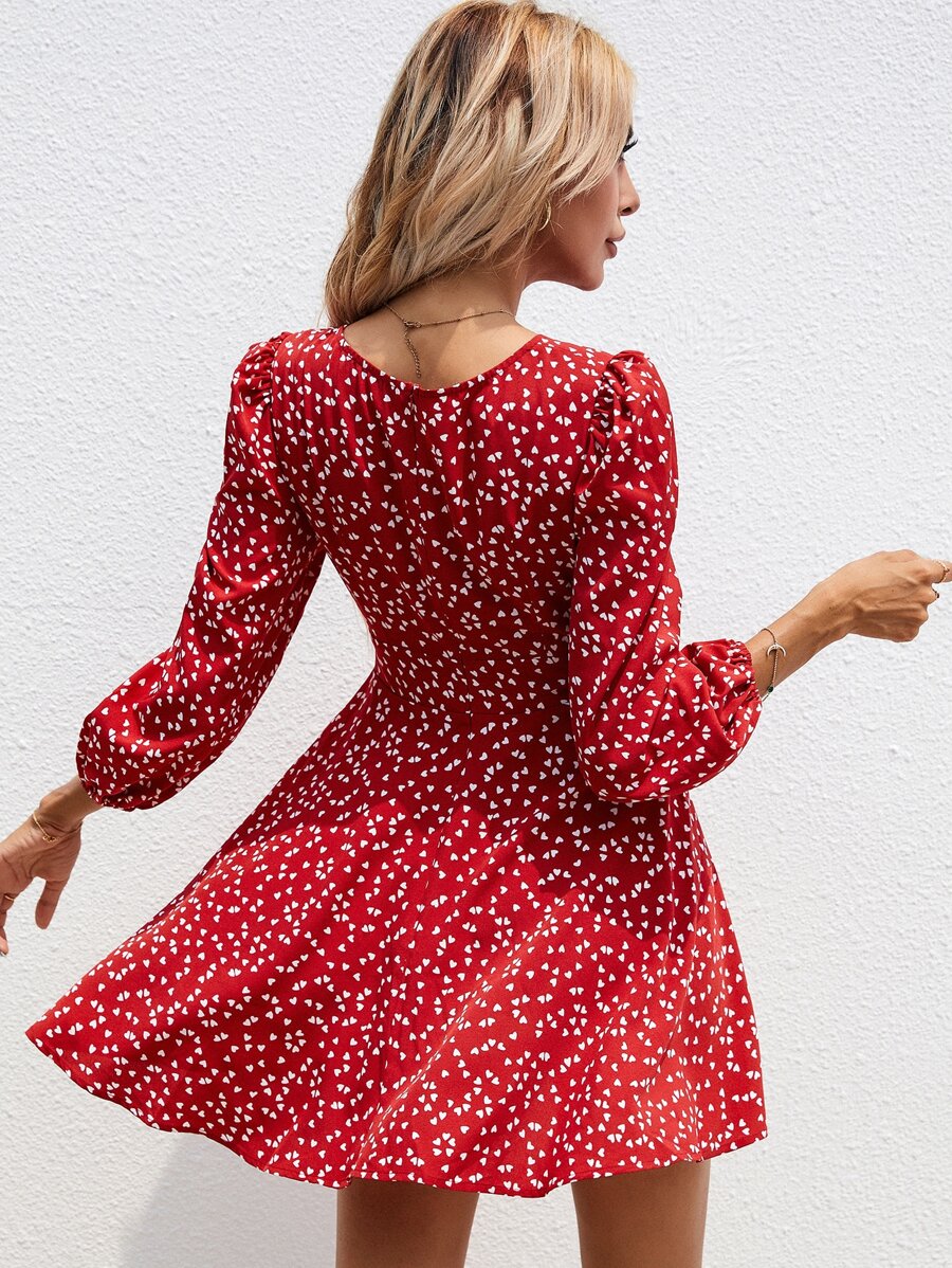 فستان بحزام بياقة مغرق بطباعة قلب