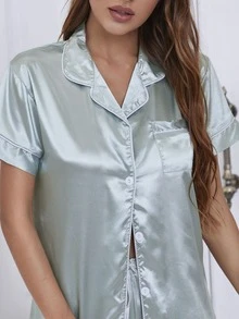 طقم بيجامة ستان بربطة امامية وبشريط مقوس متباين