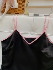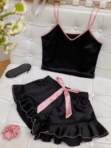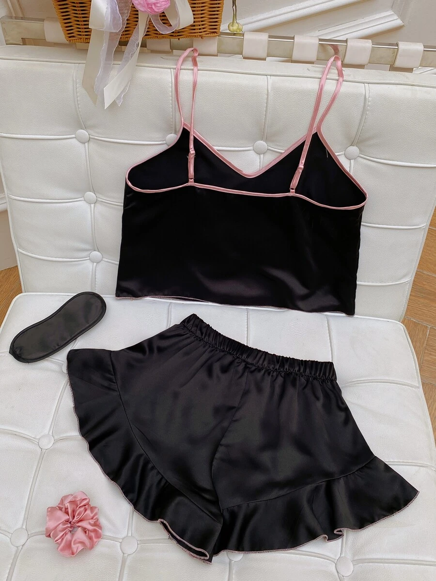 شريط متباين صدرية كامي و مقلم بكشكش بنطلون قصير طقم بيجامة مع سكرانشي تجاعيد و قناع عين