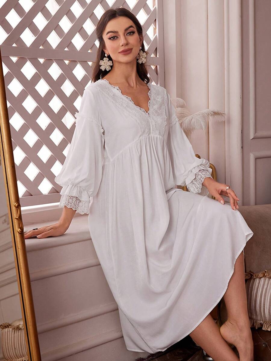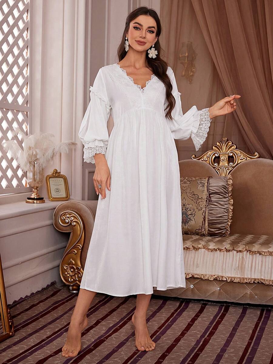 فستان نوم طويل مع تكسير الدانتيل والكشكشة