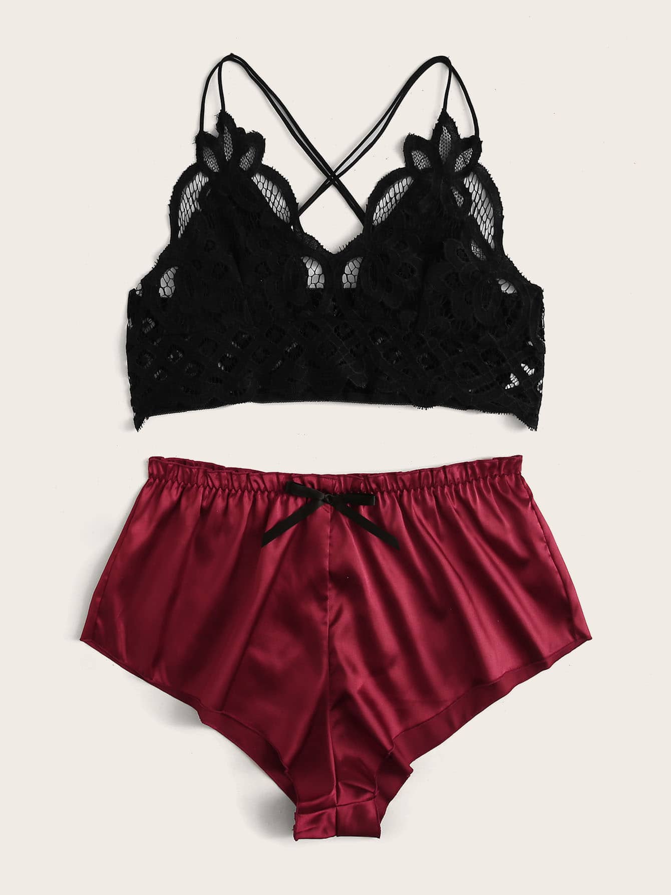 طقم ملابس داخلية ساتان بدانتيل متباين